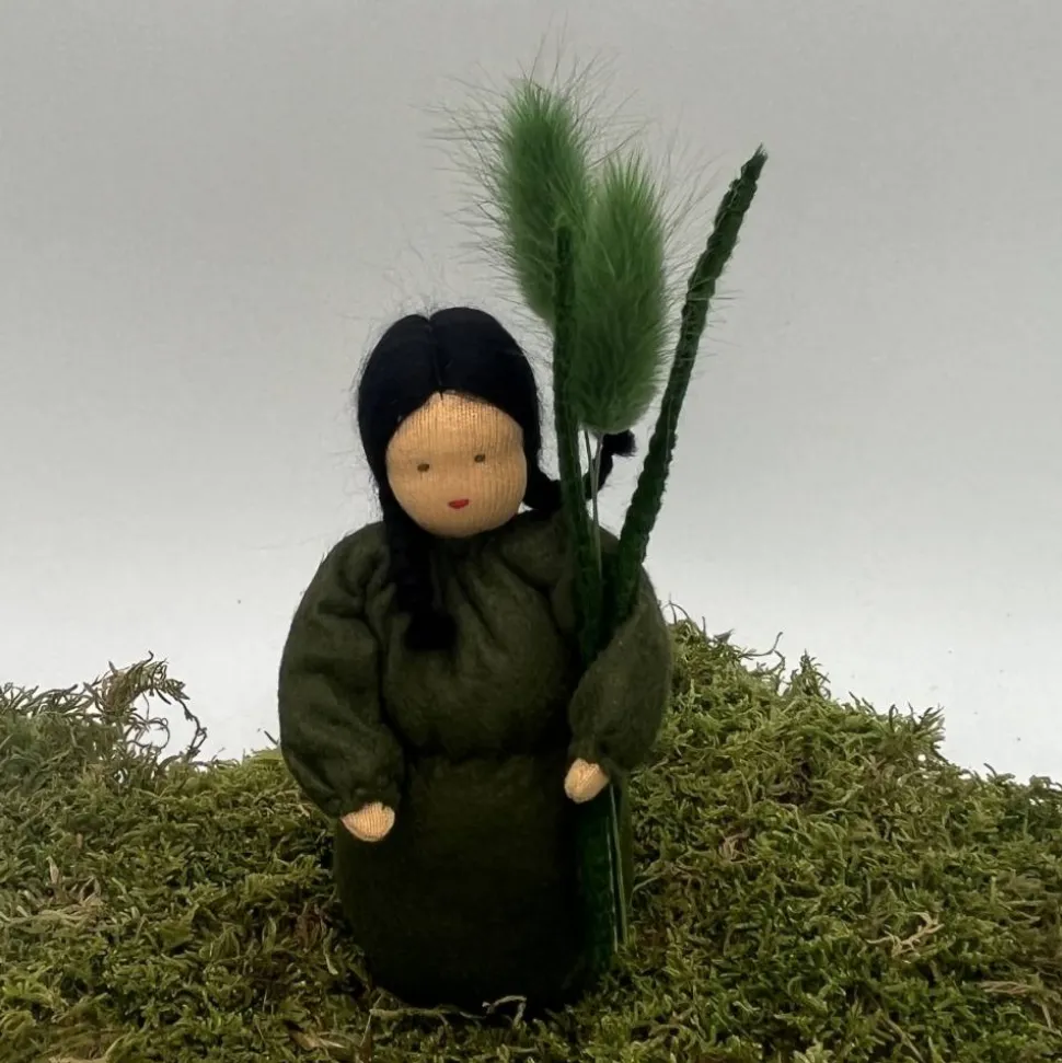 Das Püppchen ist unten geschlossen und für einen guten Stand unten mit feinem Dekokies und der Rest mit reiner Schurwolle gefüllt.