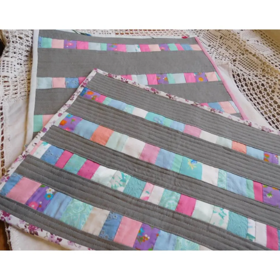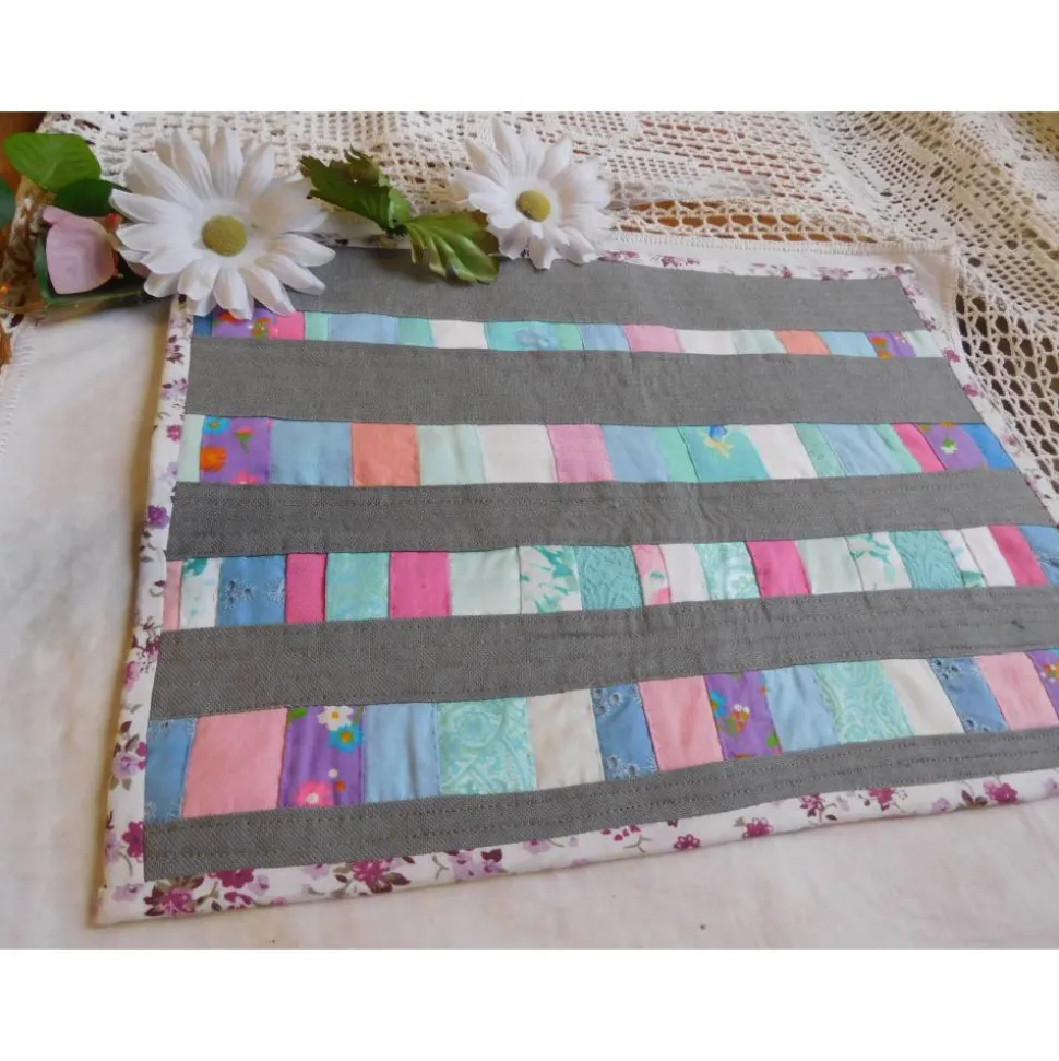 ein schönes graues Tischset mit Streifen in Pastelltönen rosa , hellblau und weiß