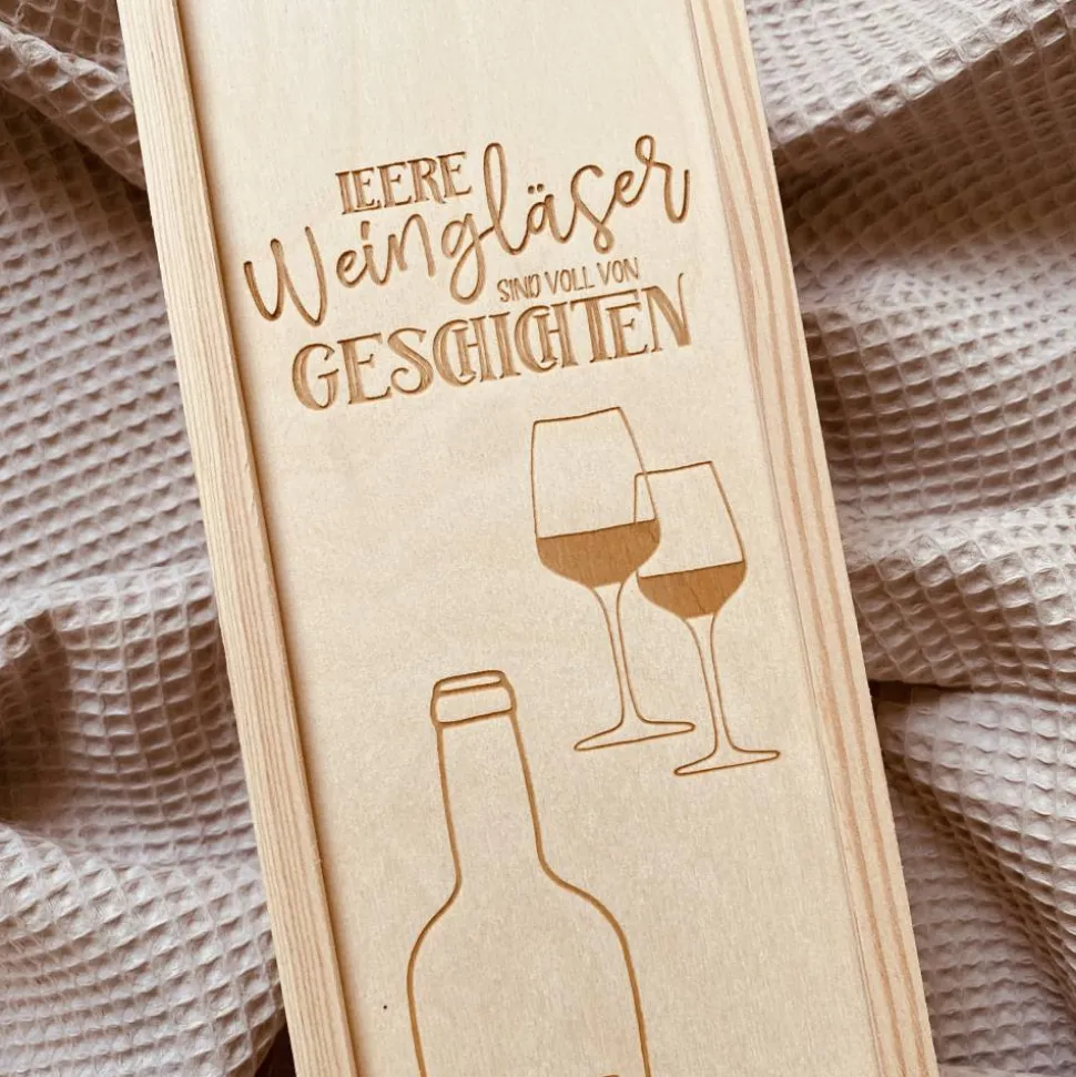 *Die Weinflasche und Dekoration sind nicht mit in der Lieferung enthalten. Es wird nur die gravierte Weinkiste geliefert.*