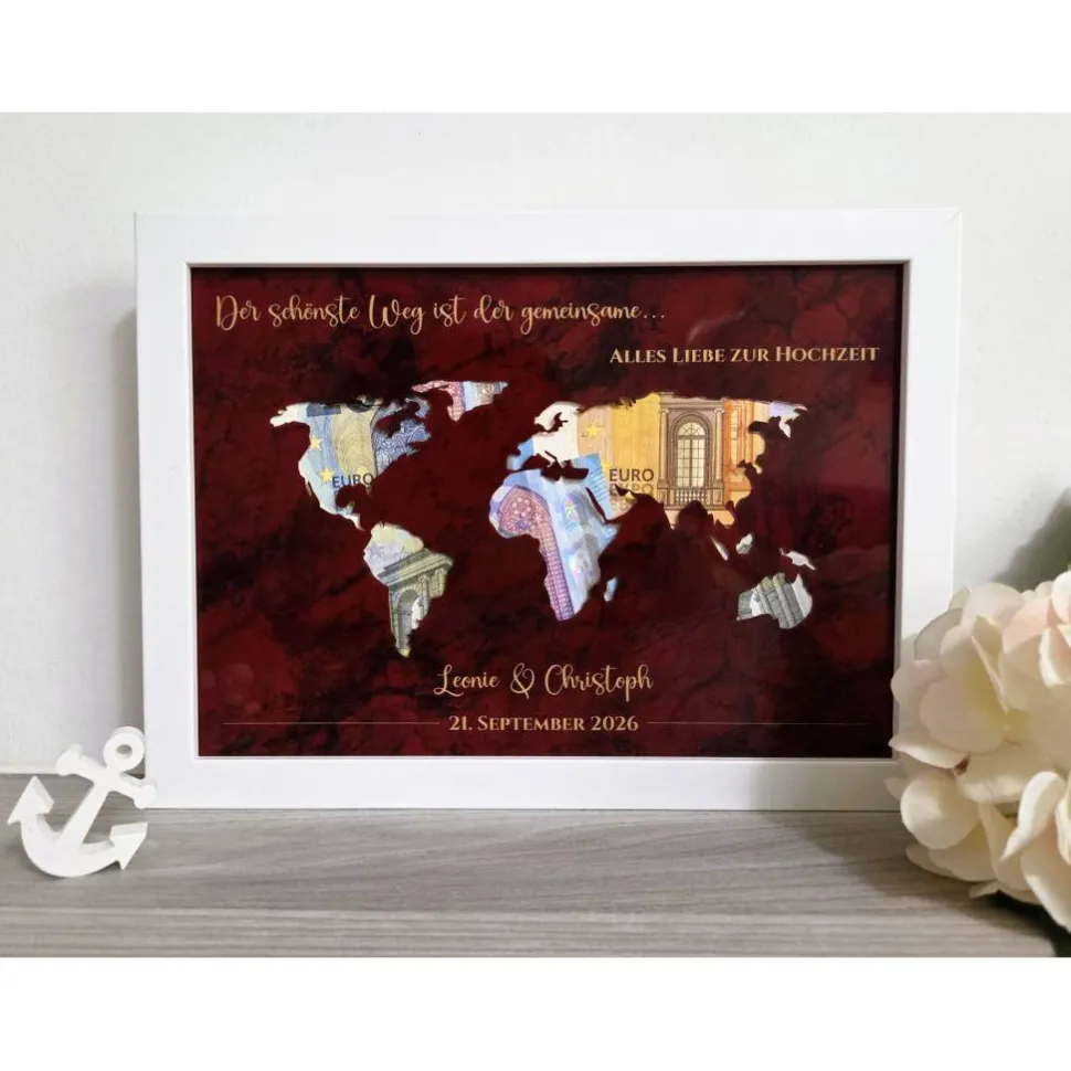 Das Motiv „Weltkarte – der schönste Weg“ ist die perfekte Wahl als Hochzeitsgeschenk / Geldgeschenk, um dem Brautpaar auch zukünftig in Erinnerung zu bleiben. Der Geldbilderrahmen bleibt auch nach der Hochzeit ein wundervolles Dekoelement für das Nest des Brautpaares.