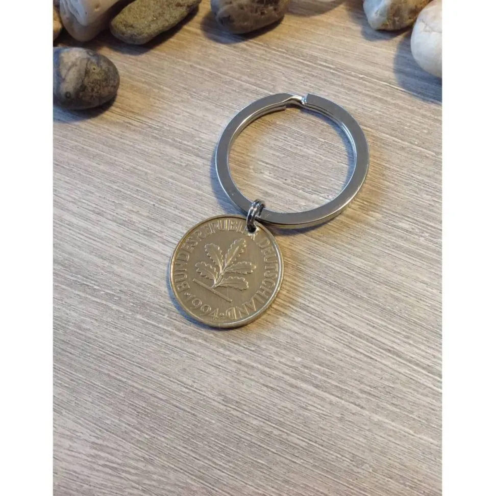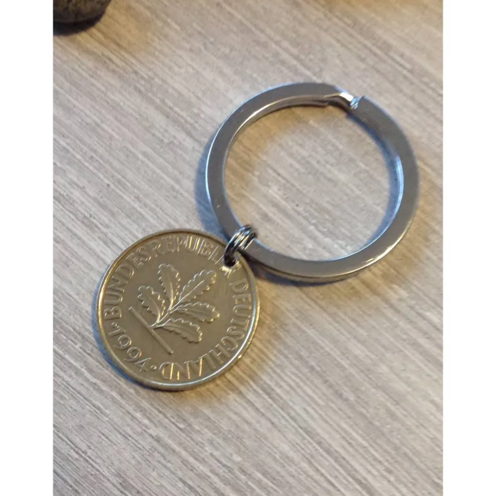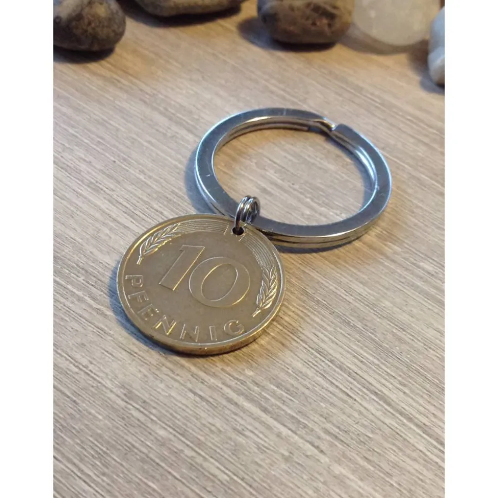 Das gut erhaltene 10-Pfennig-Stück von 1994 wurde durchbohrt und mit einem Spaltring an dem Schlüsselring ( Durchmesser 3 cm ) befestigt.
