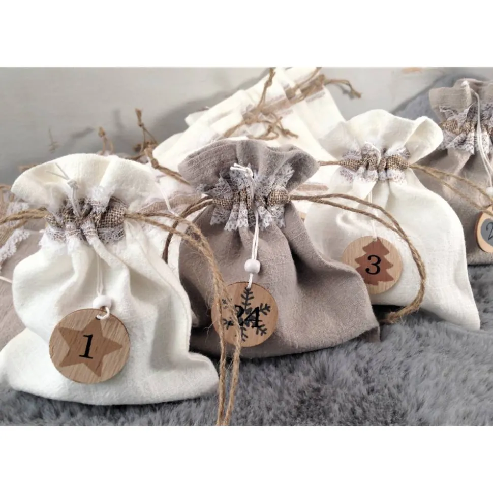 Entdecke XXl-Adventskalendersäckchen im Boho-Style aus stonewashed Leinen in Beige und Taupe! Diese hochwertigen Adventssäckchen sind in liebevoller Handarbeit gefertigt und bieten dir die perfekte Grundlage für einen nachhaltigen und individuellen Adventskalender.