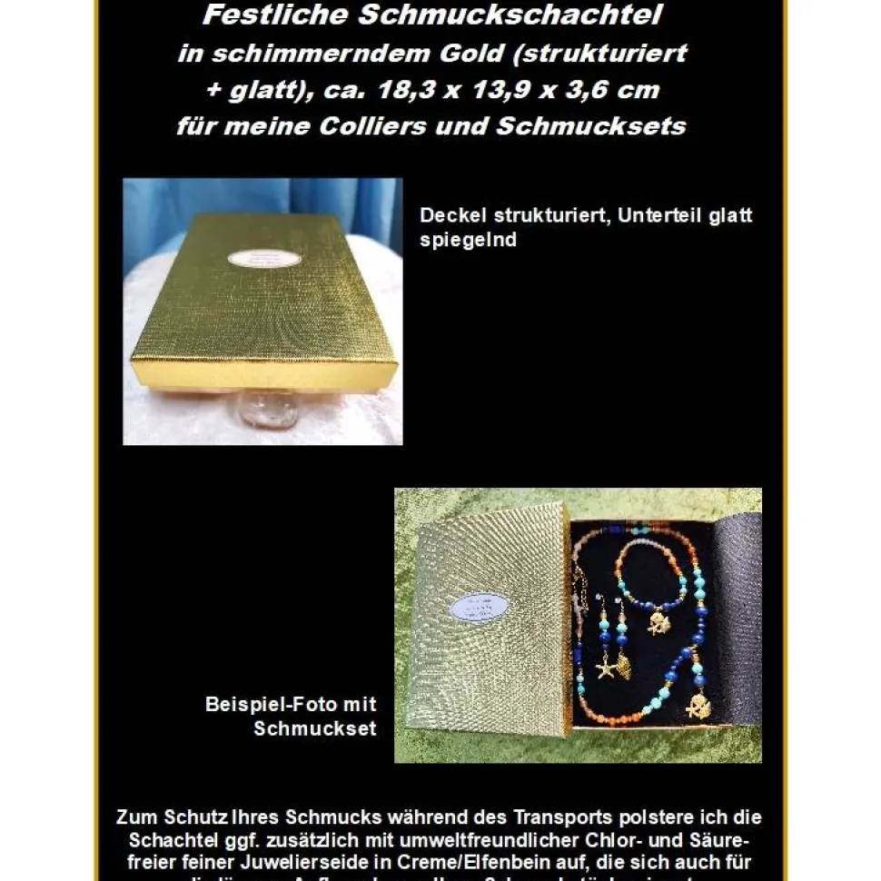 Diese große, festlich schimmernde Schmuckschachtel in Gold können Sie als Geschenk-Verpackung für meine Colliers und (größeren) Schmucksets (dazu) bestellen, um Ihr außergewöhnliches Geschenk besonders edel zu präsentieren. Der Deckel hat eine strukturierte Oberfläche, das Unterteil ist spiegelnd glatt. (Der Gold-Ton des Unterteils ist in der Realität nicht so rötlich wie auf den Fotos)