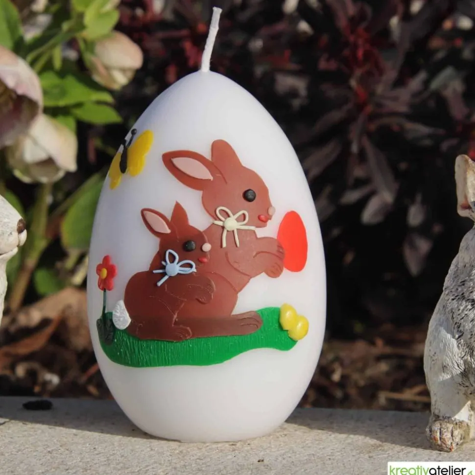 Die Verarbeitung der Symbole auf der Kerze ist detailreich und von Hand gefertigt. Die Hasen, die Wiese und die Ostereier wurden einzeln aus Wachs ausgeschnitten und kunstvoll auf der Kerze angebracht. Das macht jede Kerze zu einem individuellen Unikat.