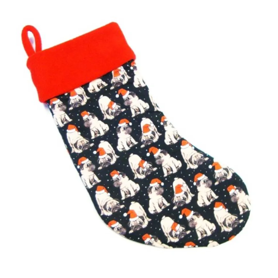 Großer Nikolausstiefel Nikolausstrumpf Mopsi Hund und roter Fleece Krempe Weihnachtsstrumpf handgefertigt mit oder ohne Name kaufen für Kinder und Erwachsene.