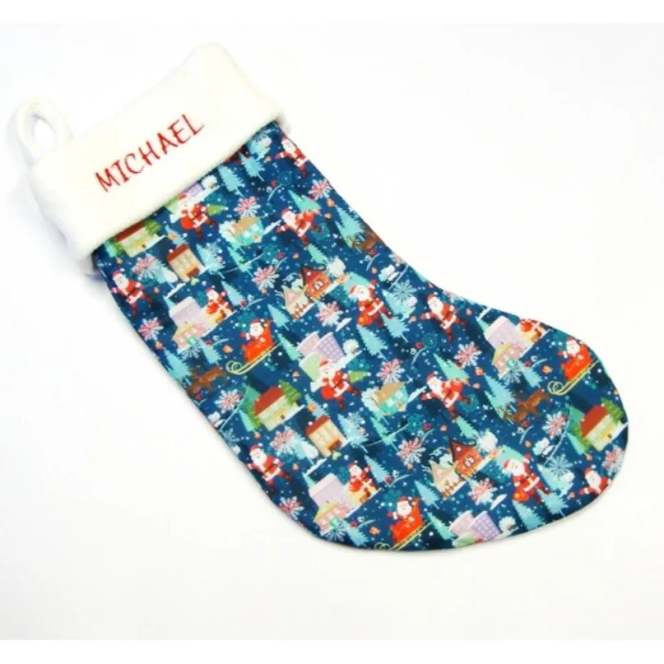 Großer Nikolausstiefel Nikolausstrumpf Nikolaus mit Schlitten Tannenbaum und weißer Fleece Krempe Weihnachtsstrumpf handgefertigt mit oder ohne Name kaufen für Kinder und Erwachsene.