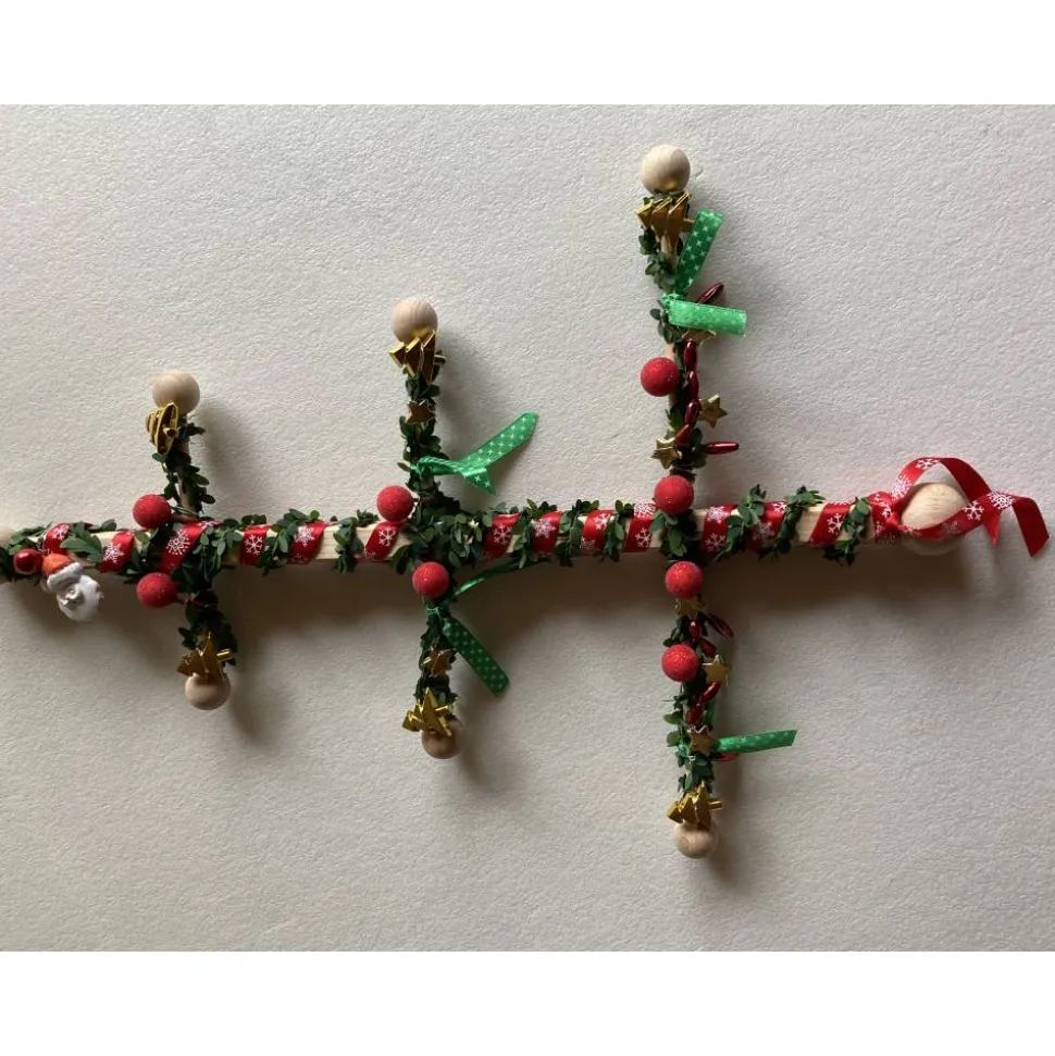 Großer Friesenbaum aus Holz, Bastelzierelemente wie grüne Girlande, rotes Band, rote Kugeln, goldfarbene Sterne und Weihnachtsbäumchen, grüne Bänder und ein Nikolausgesicht.