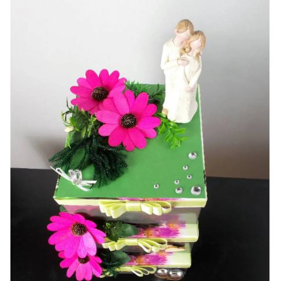 Schickes, modernes Geldgeschenk zur Hochzeit. Dieses Geschenk ist der Hingucker auf dem Geschenketisch. Die 3-stöckige „Torte“ wurde aus stabilen Geschenkboxen angefertigt und mit Blüten und Bändern reichlich verziert. Jede Box lässt sich öffnen, so haben Sie viel Platz für Glückwünsche und können wenn Sie möchten auch Geld mit hinein geben.