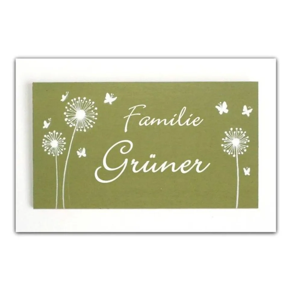 Das Schild wird nach deinen Vorgaben personalisiert: Du wählst Familienname und Schriftart (Auswahltabelle bei den Fotos). Standardmäßig pistaziengrün grundiert, kannst du auf Wunsch auch Farben wie Hellgrau, Dunkelgrau, Dunkelblau, Bordeauxrot oder Schwarz wählen – eine Nachricht beim Kauf genügt. Links und rechts verzieren handgemalte Pusteblumen und fliegende Schmetterlinge das Namensschild.