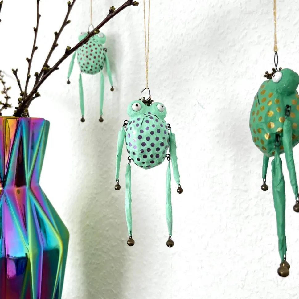 Dieses entzückende Froschglöckchen habe ich aus Papier und Draht hergestellt, bemalt und mit Glöckchen und Bronzekrone dekoriert. Es macht sich hervorragend im Osterstrauß, am Türkranz oder als kleines Geschenk.