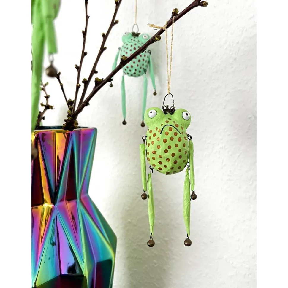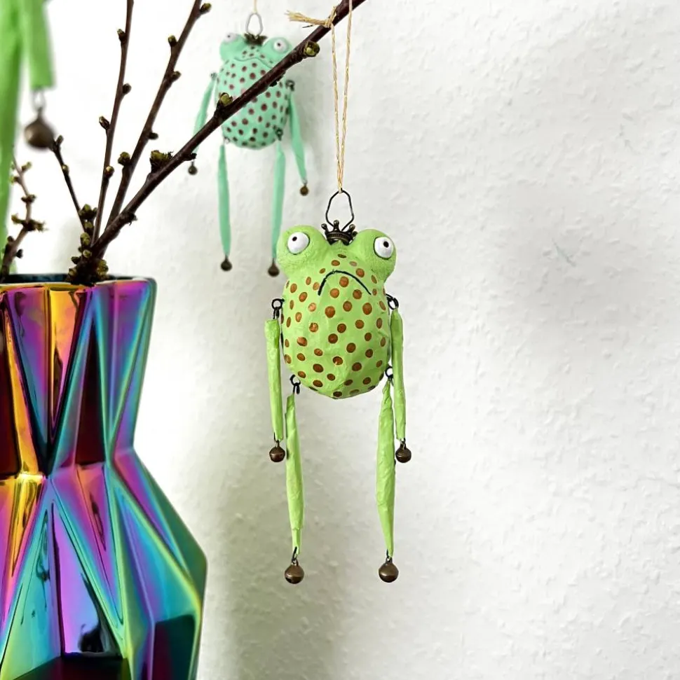 Dieses drollige Froschglöckchen habe ich aus Papier und Draht hergestellt, bemalt und mit Glöckchen und Bronzekrone dekoriert. Es macht sich hervorragend im Osterstrauß, am Türkranz oder als kleines Geschenk.