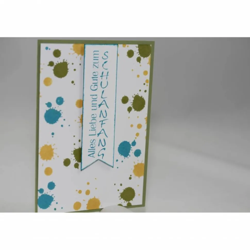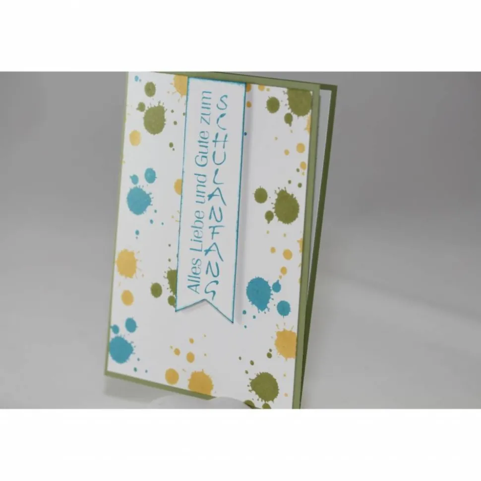 Die Grundkarte ist hellgrün, darauf ist ein weißer Aufleger dessen Hintergrund mit bunten Klecksen in grün, türkis und gelb gestaltet wurde. Der Gruß wurde auf ein Banner gestempelt und an den Rändern türkis gewischt. Der Gruß wurde mit Abstandklebepads aufgeklebt.