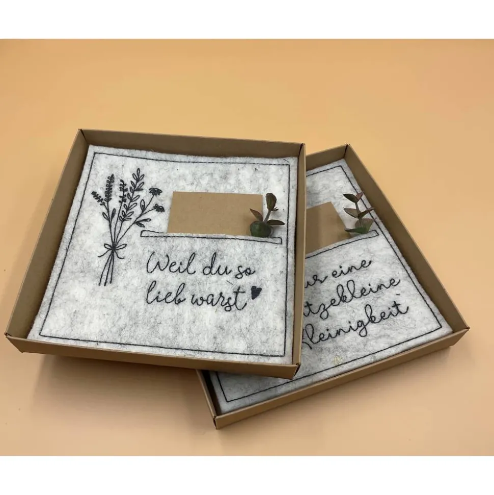 Im Inneren eine bestickte Filzkarte mit Einschub für Geld oder eine Botschaft, oder Beides!