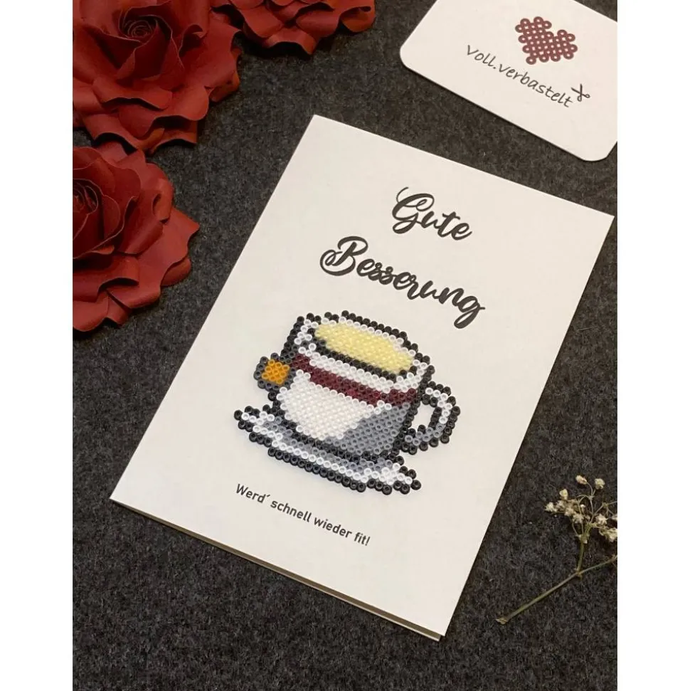Das Motiv wird aus Mini-Bügelperlen gesetzt und gebügelt. Ein Umschlag aus Kraftpapier ist inklusive.