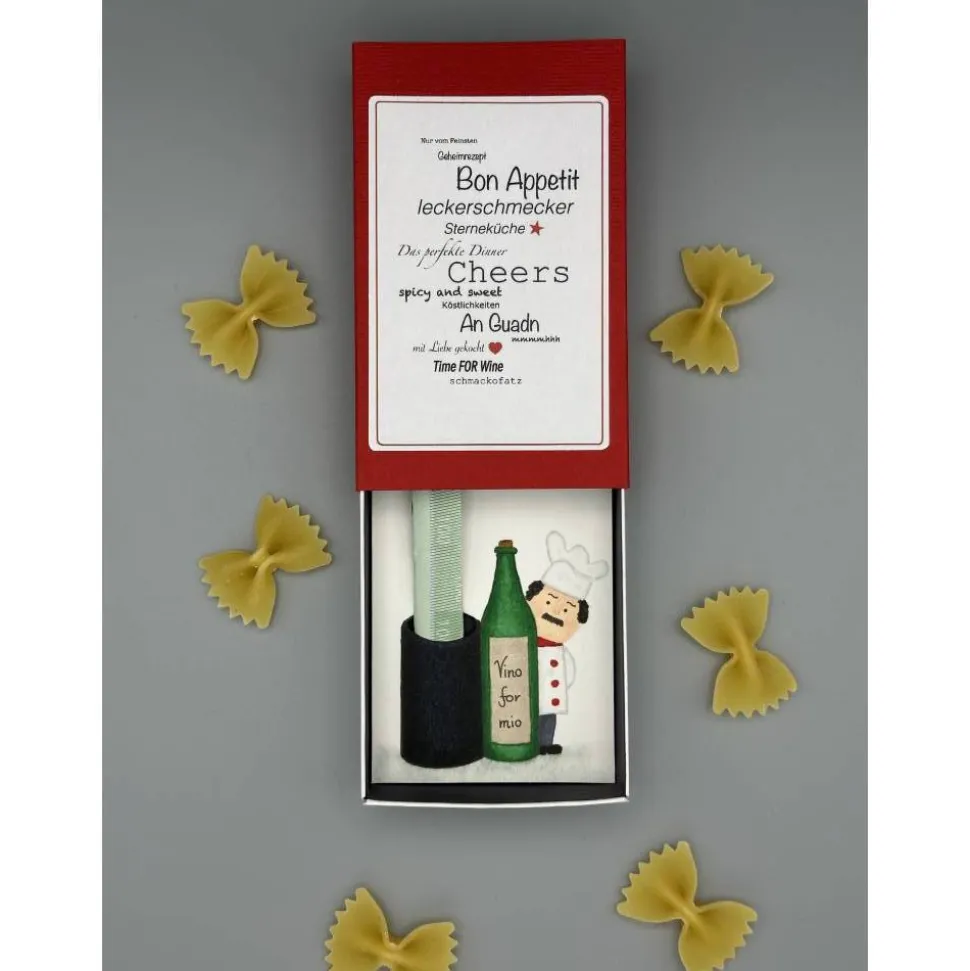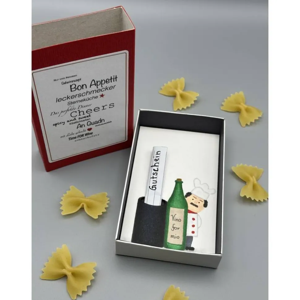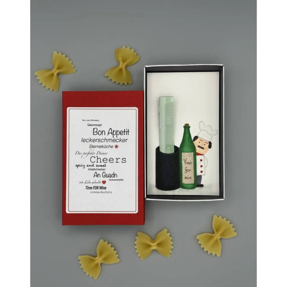 Im Inneren der Schachtel findest du einen handgemalten kleinen Koch mit Weinflasche und einem Topf. In den Topf ist ein Loch gestanzt, damit du ganz einfach deinen Gutschein, eine Einladung oder auch einen Geldschein einstecken kannst. Einfach den Schein oder Gutschein einrollen, platt drücken und in den Topf stecken. Beachte bitte, dass nur ein Schein hineingesteckt werden sollte.