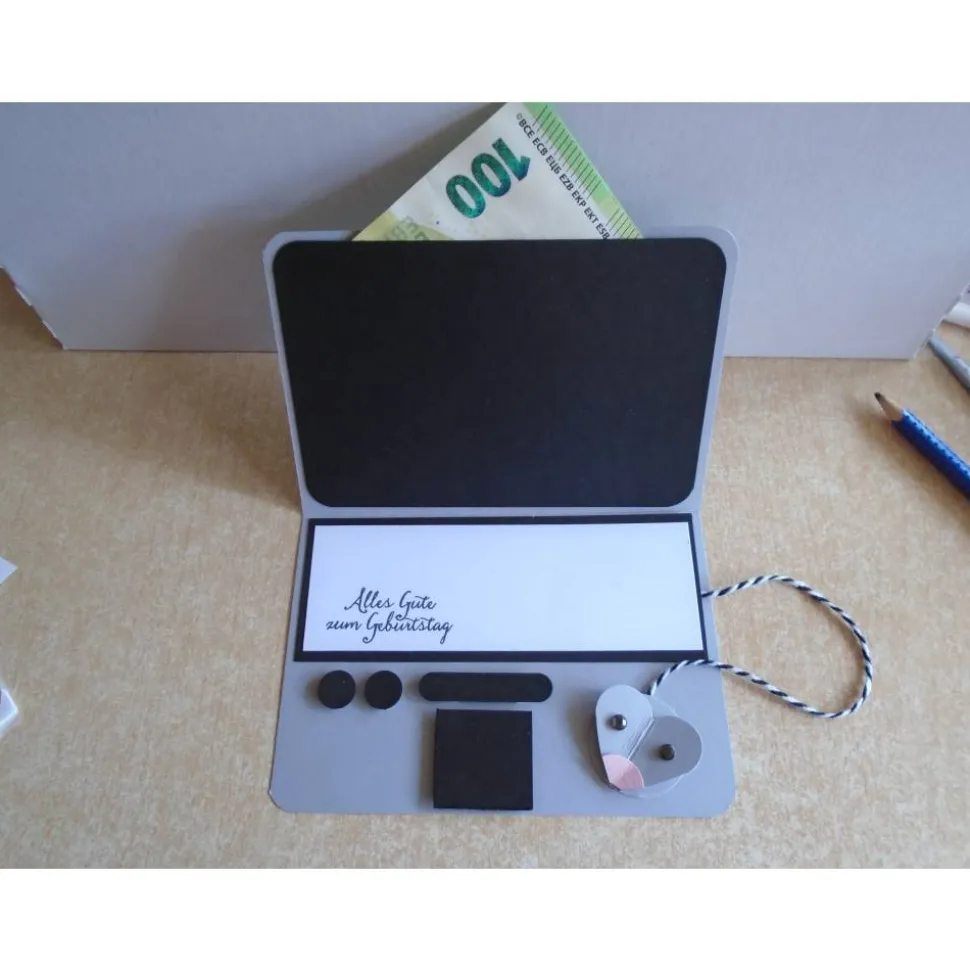 Verziert wurde diese Laptopkarte Gutschein Geldgeschenk zum Geburstag mit Geldfach und Maus…