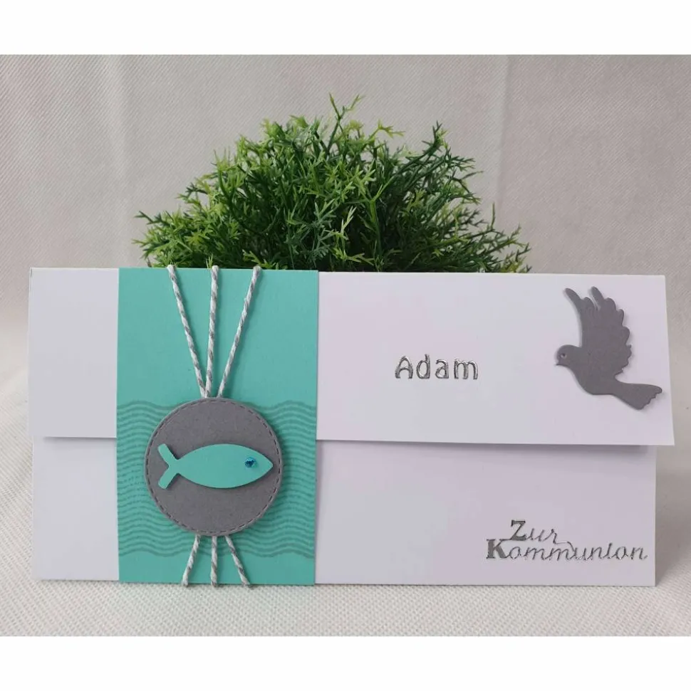 Die Geschenkverpackung ist ideal geeignet für Geldgeschenke oder Gutscheine. Die Verpackung ist umhüllt mit einer Banderole aus hochwertigem Kartenkarton – diese wurde bestempelt und verziert mit Baumwollkordel und handgestanztem Fisch.