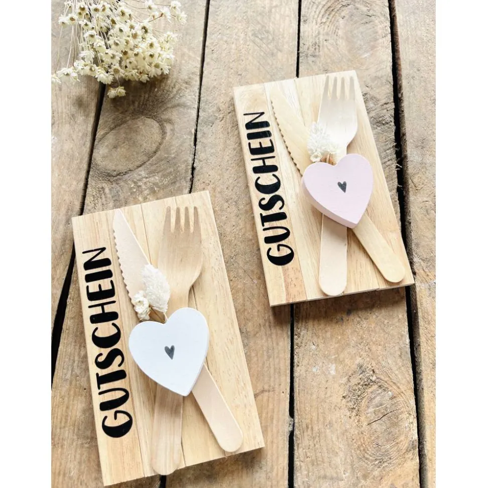 Du möchtest einen Gutschein für ein gemeinsames Essen oder einen Restaurantbesuch verschenken? Mit diesem Gutschein aus Holz ist das eine ganz besonders hübsche Idee.