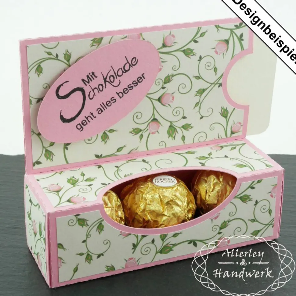 In die Box mit Sichtfenster passen drei der goldenen Kugeln einer bekannten Süßigkeitenfirma oder natürlich jedwedes andere Geschenk, was der Größe der Box entspricht (und nicht herausfallen kann).