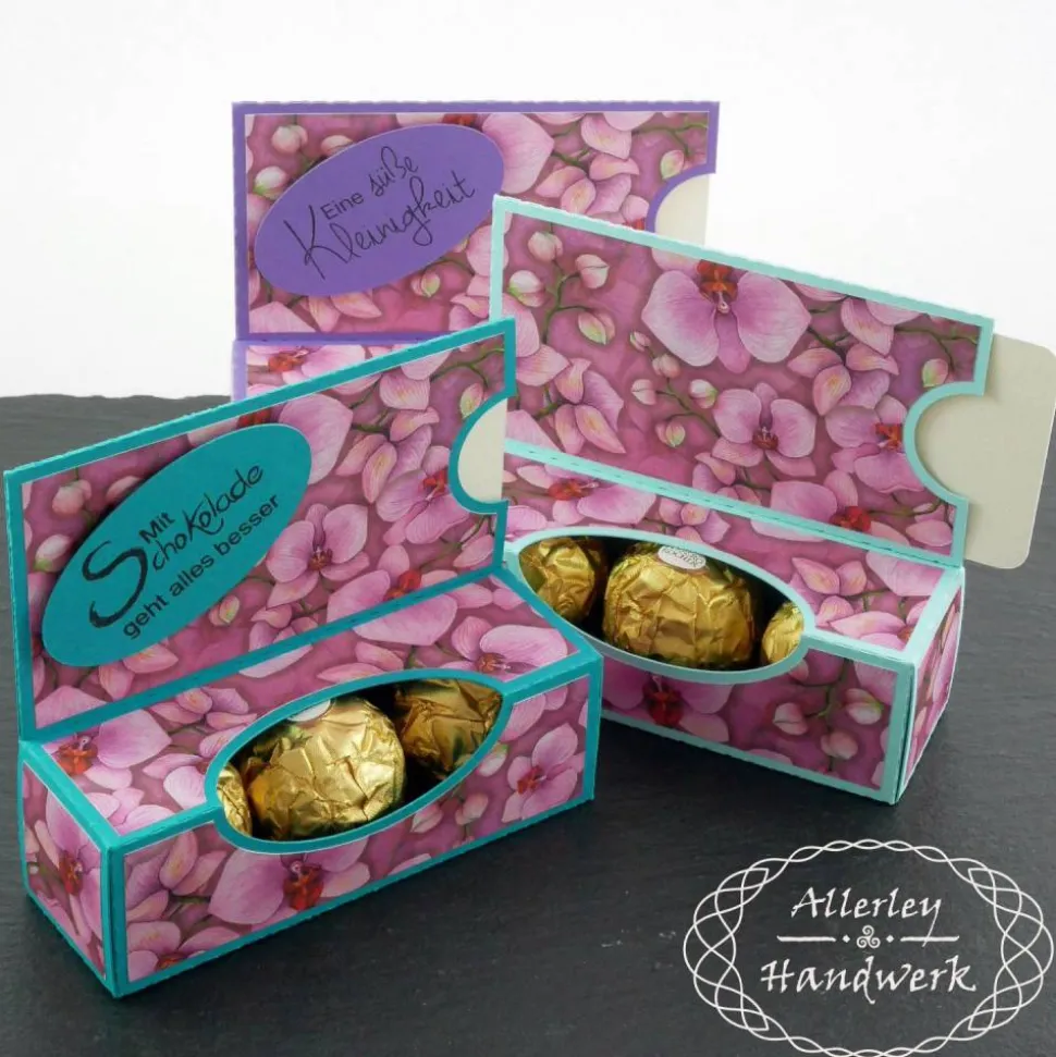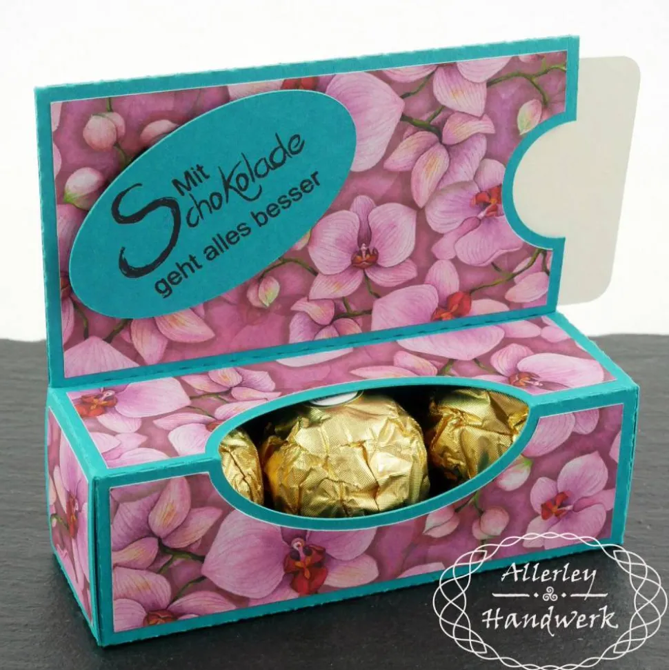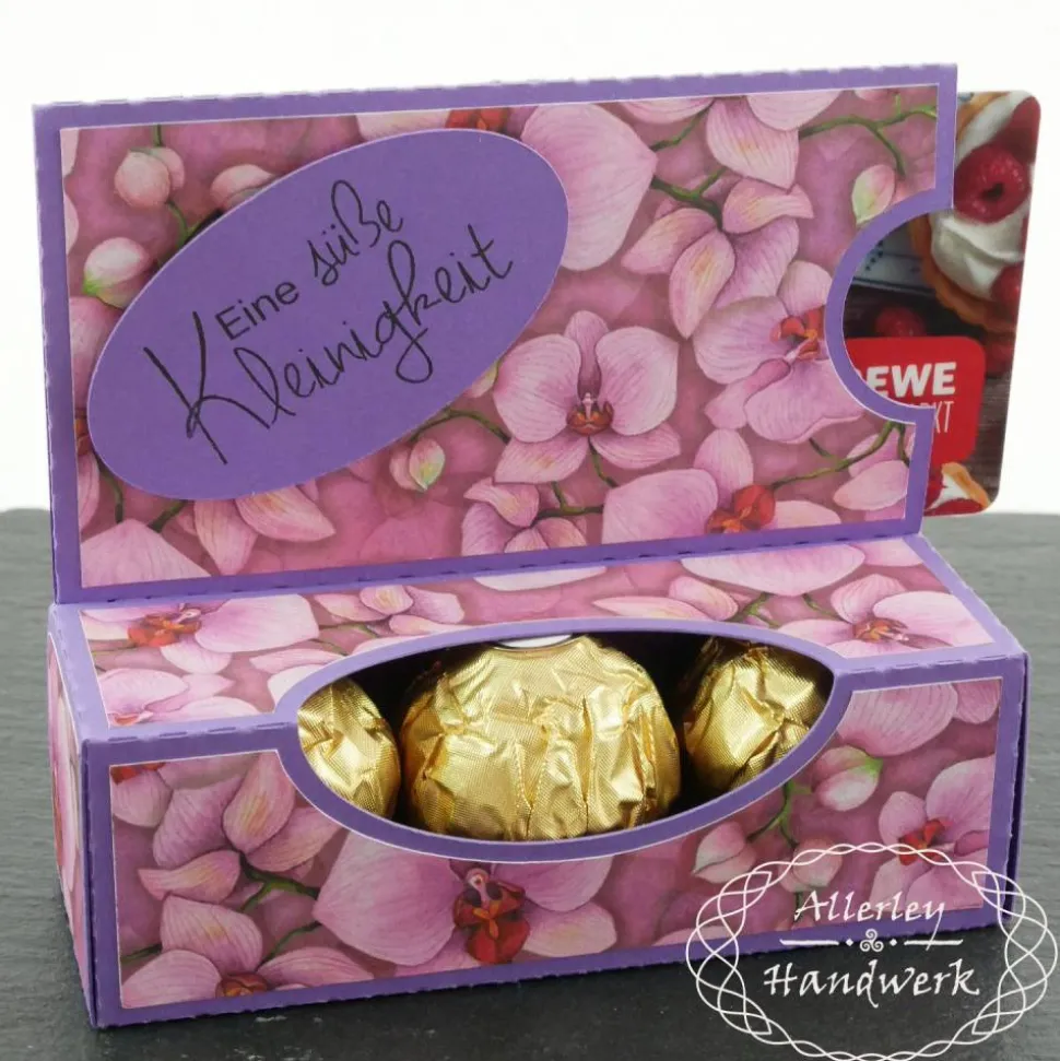 In die Box mit (gänzlich offenem!) Sichtfenster passen drei der goldenen Kugeln einer bekannten Süßigkeitenfirma oder natürlich jedwedes andere Geschenk, was der Größe der Box entspricht (und nicht herausfallen kann).