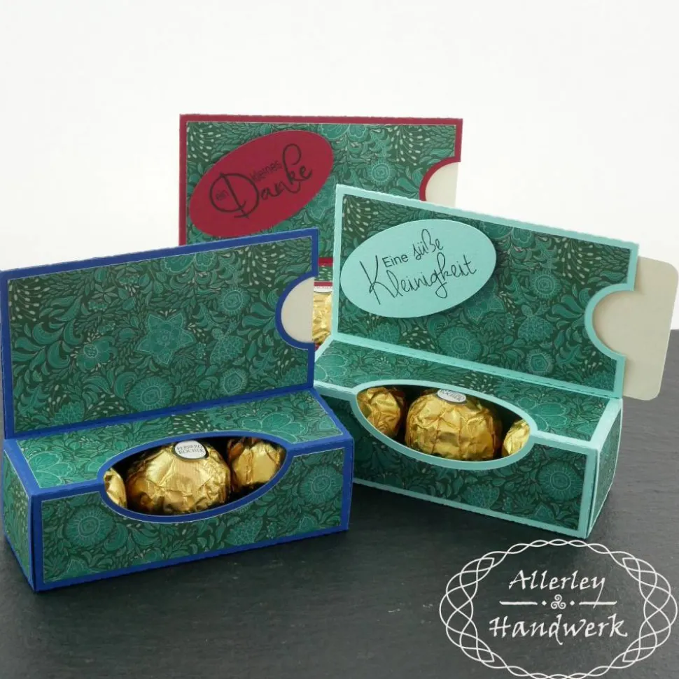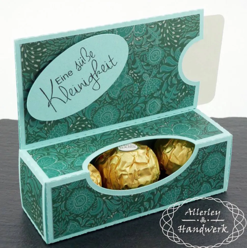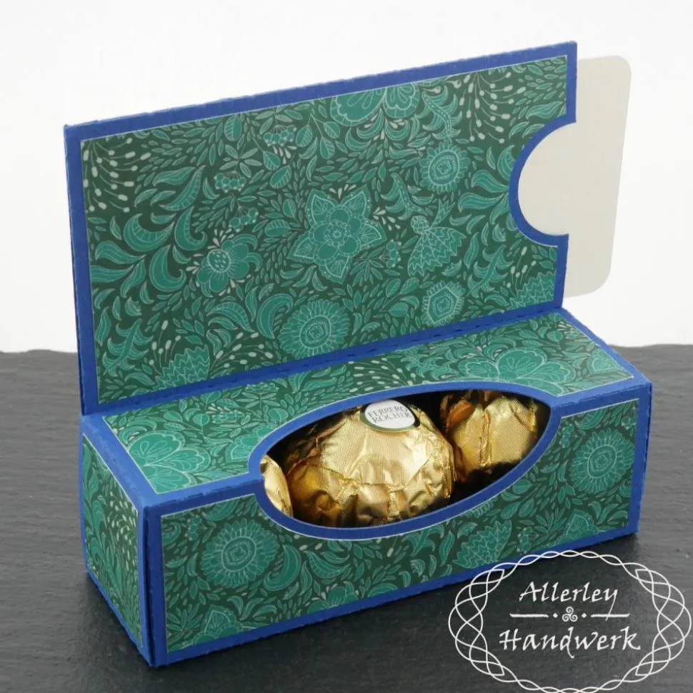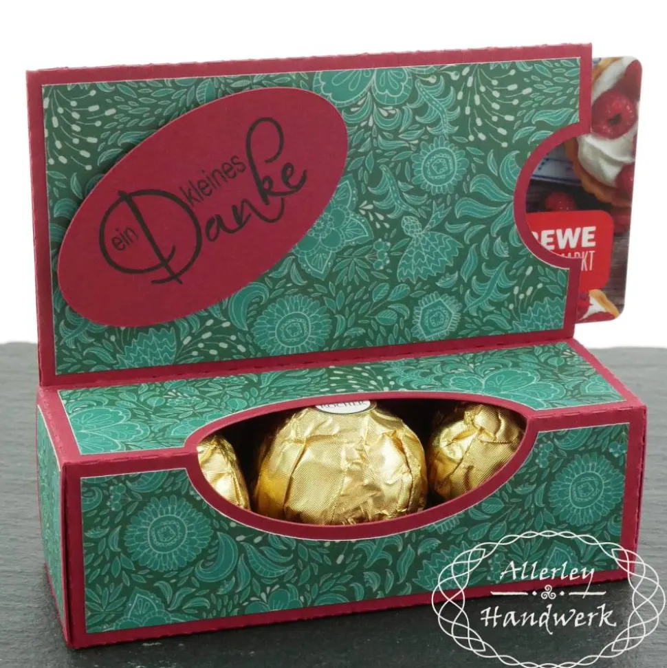 In die Box mit Sichtfenster passen drei der goldenen Kugeln einer bekannten Süßigkeitenfirma oder natürlich jedwedes andere Geschenk, was der Größe der Box entspricht (und nicht herausfallen kann).