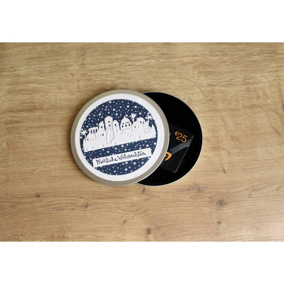 Die kleine Metalldose kann man öffnen und den Geschenkgutschein in eine vorgefertigte Form eindrücken. Ein weiteres Verpacken ist gar nicht nötig, somit spart man sich Arbeit und Verpackungsmüll. Die Dose kann immer wieder verwendet werden, um lieben Menschen ein Lächeln ins Gesicht zu zaubern.