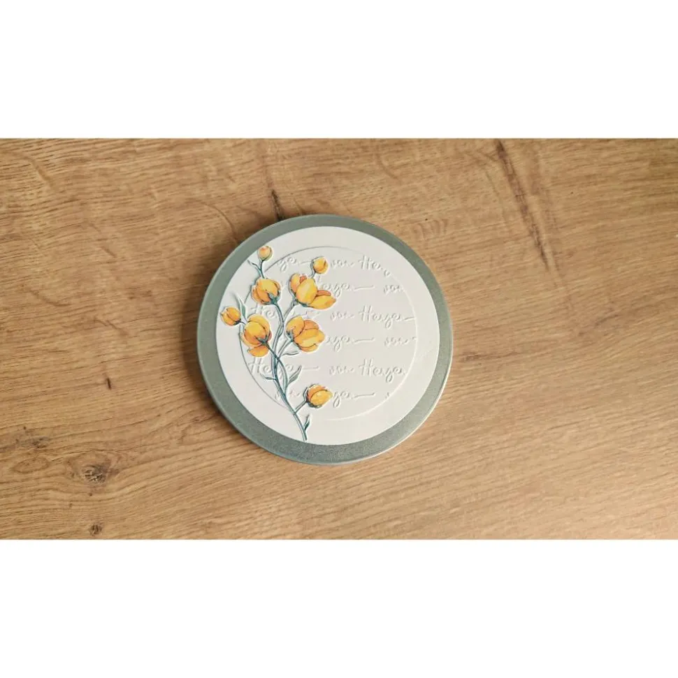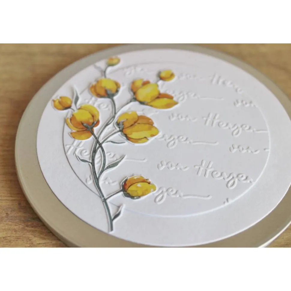 Die Gutscheindose „Butterblume“ kann für viele Gelegenheiten verwendet werden. Die geprägten Worte „von Herzen“ in edlem weiß bringen die Butterblume wunderschön zur Geltung.