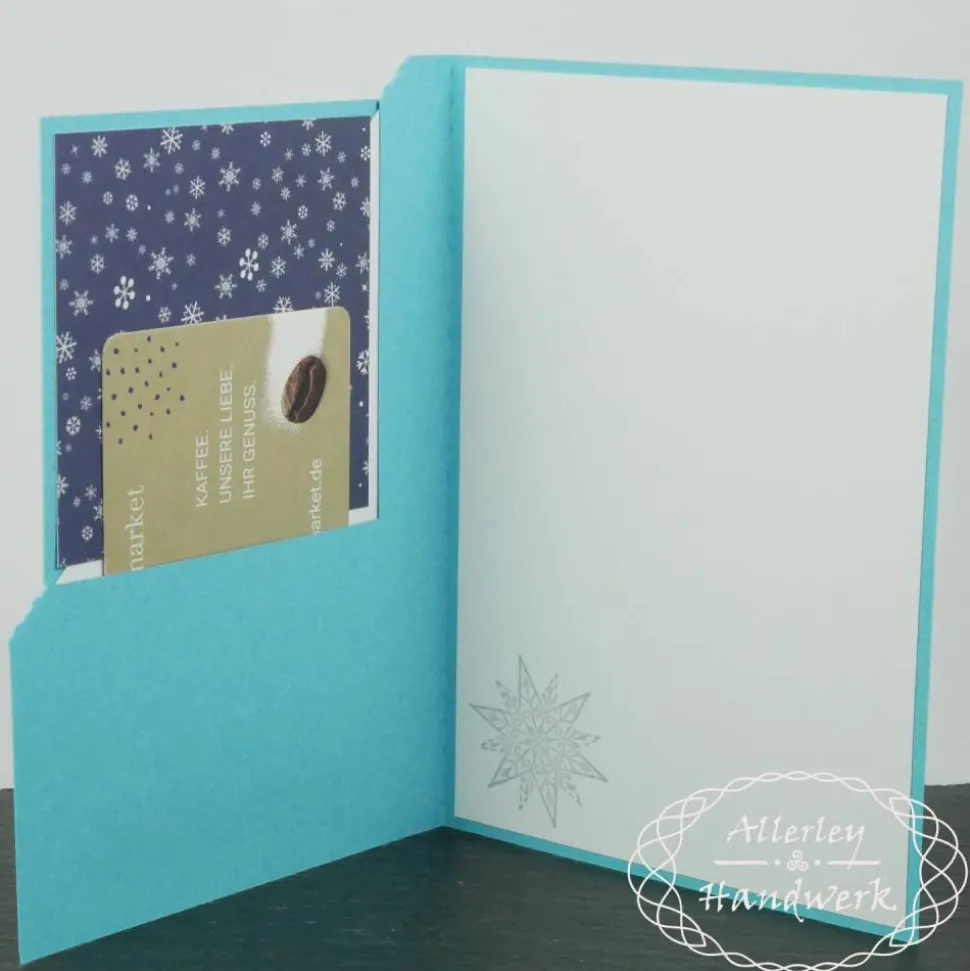 Durch das pfiffige Design mit einem „Eselsohr“ auf der Vorderseite entsteht nicht nur ein schöner farblicher Absatz sondern gleichzeitig auch eine Einsteckmöglichkeit für eine Gutscheinkarte auf der Innenseite. Es passen alle Gutscheine im klassischen Scheckkartenformat hinein. Alternativ kann man natürlich auch direkt einen gefalteten Geldschein oder andere passende Dinge unterbringen, ganz nach Wunsch.