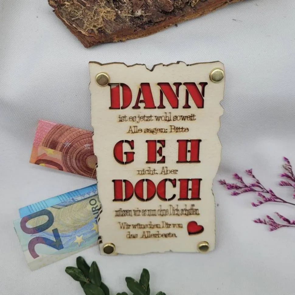 Hier sind Abschied und Glückwunsche dekorativ auf dieser Holzkarte untergebracht.Mit liebevollen Glückwünschen und etwas Humor verpackt, wird der Abschied zu einem besonderen Erlebnis. Zeigen Sie, dass Sie den Kollegen vermissen werden .