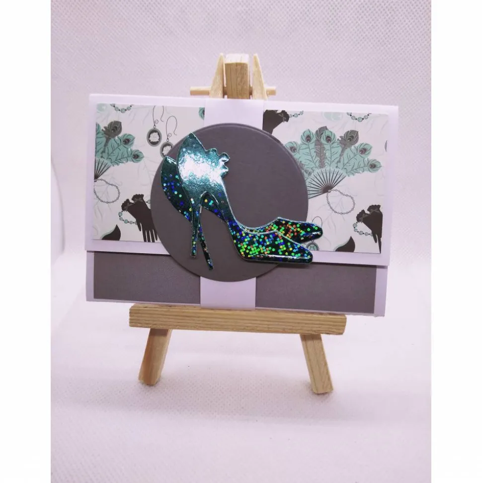 Verwendet habe ich hier eine weiße Grundkarte, Designpapier in türkis-gemustert, grauen Karton, weißen Karton, Text „Gutschein“ in türkis