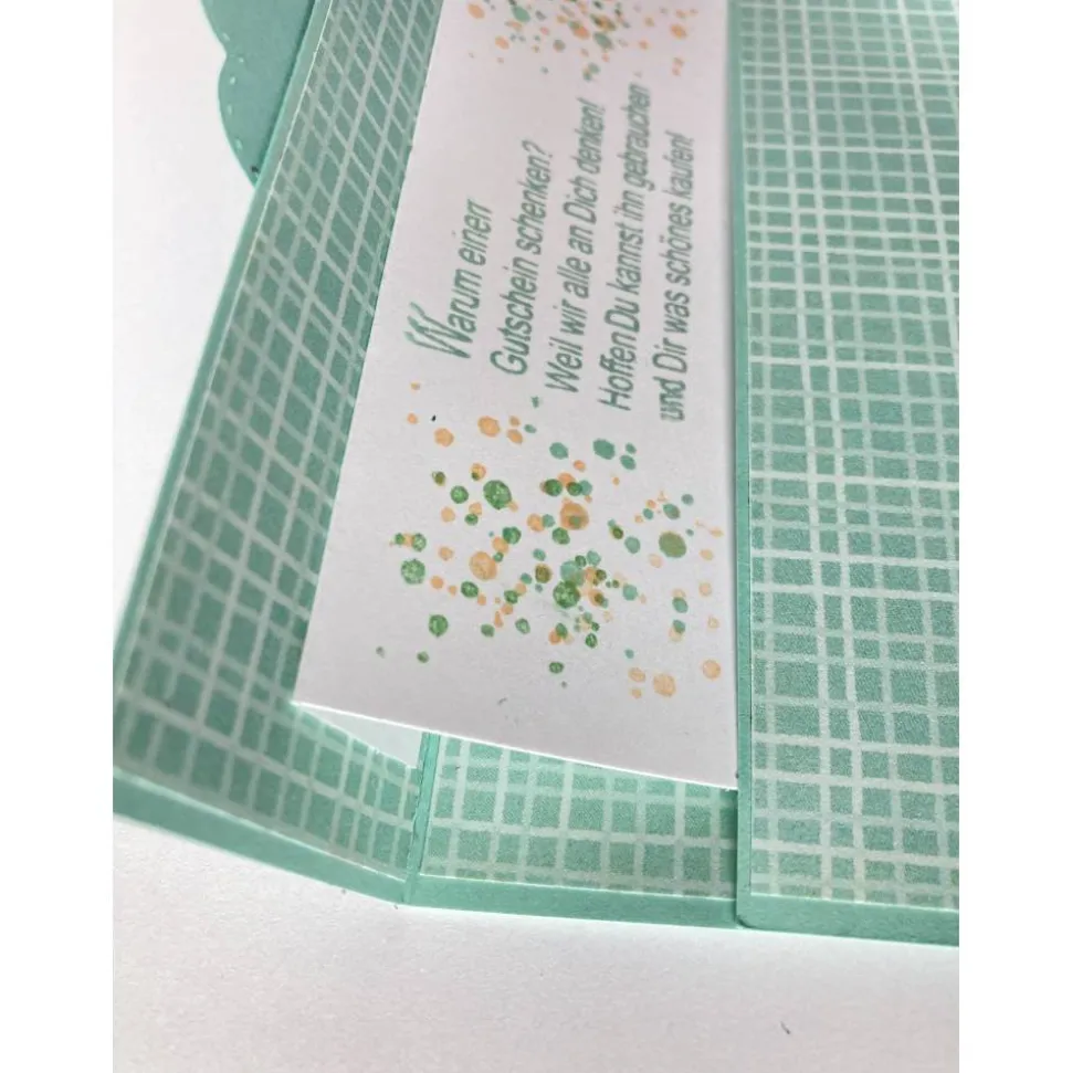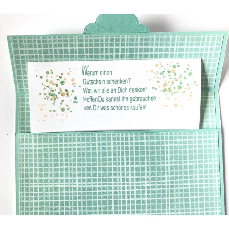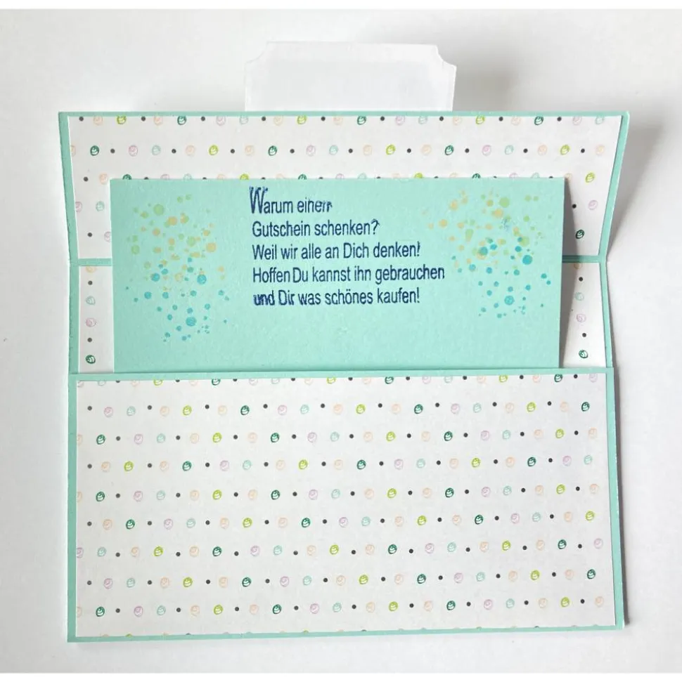 Wenn die Karte geöffnet wird, wird gleichzeitig ein Schiebefach geöffnet. In dieses Fach können Sie Geldscheine oder Gutscheine legen.