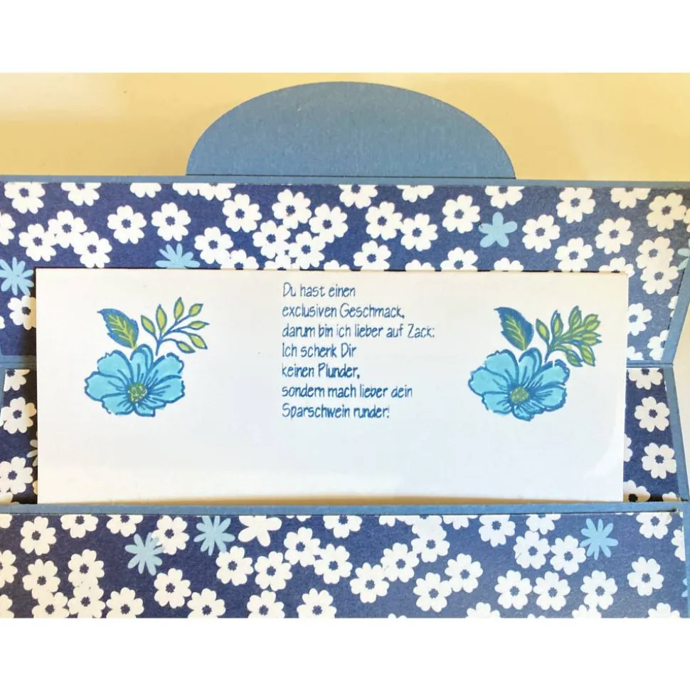 Der Kartenspruch im innern der Karte lautet:Du hast einenexklusiven Geschmack,darum bin ich lieber auf Zack:Ich schenk Dir keinen Plunder,sondern mach lieber dein Sparschwein runder.