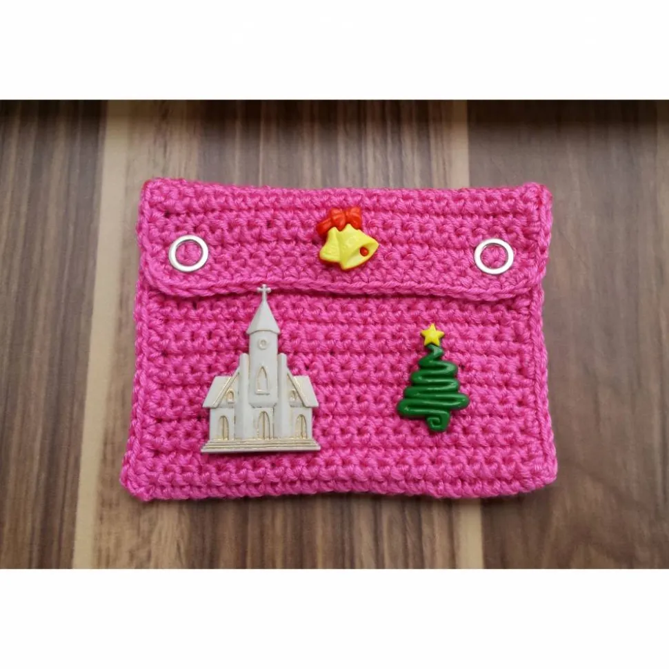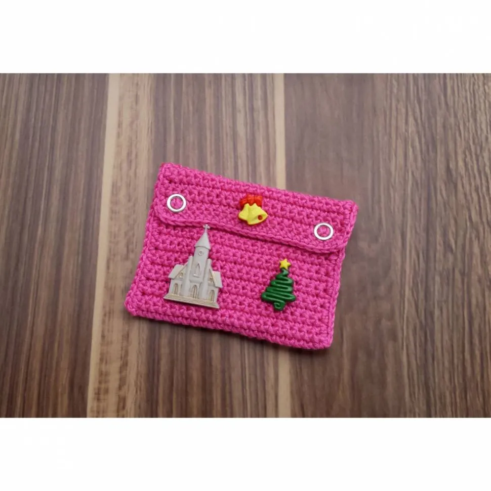 Sehr schönes Weihnachtsgeschenk ! Gutscheinkarten Täschchen Weihnachtskirche Ideale Verpackung für Gutscheinkarten, Geld, Schmuck oder andere Kleinigkeiten gehäkelt verziert mit Motiv-Knöpfen verschlossen mit Druckknöpfen