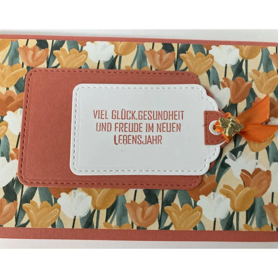 Die Karte wurden aus hochwertigen Materialien von Stampin up und Designpapier mit Tulpen und einer Metallbiene.