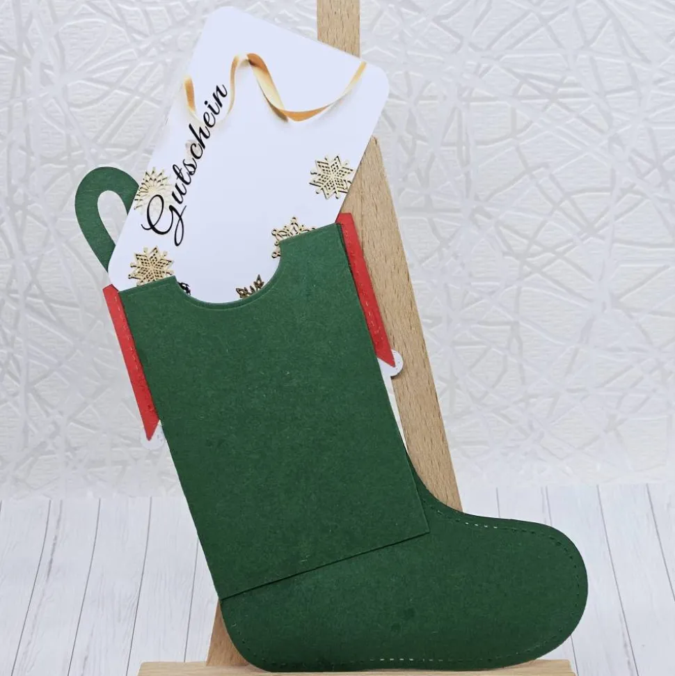 Diese liebevoll gestaltete Gutscheinverpackung in Form einer festlichen Weihnachtssocke im fröhlichen Elfen-Design ist ein echter Hingucker unter dem Weihnachtsbaum. Gefertigt aus stabilem 300 g/m² Fotokarton, kombiniert die Socke kräftiges Grün mit leuchtendem Rot und kleinen goldenen Pailletten, die wie Glöckchen funkeln. Damit ist sie nicht nur eine originelle Verpackung, sondern zugleich eine wunderschöne Dekoration für die Adventszeit.