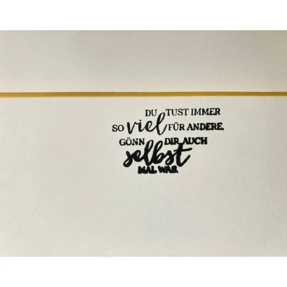 Im Innern der Karte ziert der Spruch „ Du Tust immer so viel für andere, gönn Dir auch selbst mal was“ die Karte.