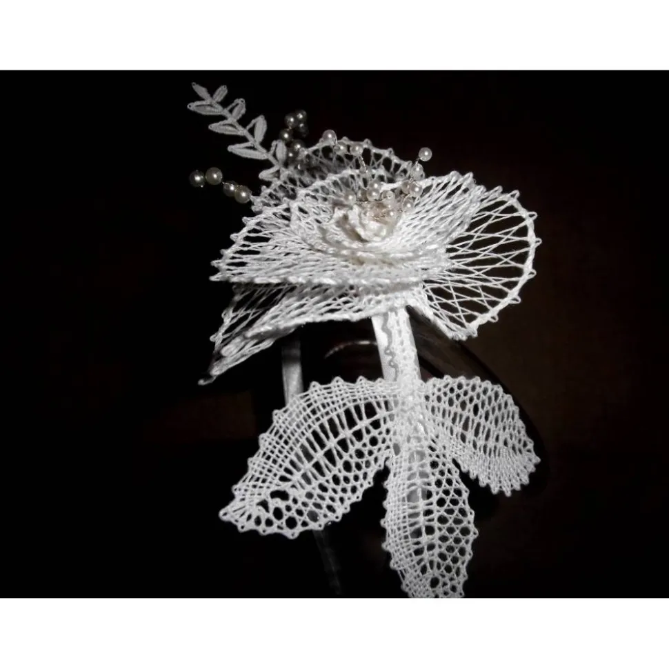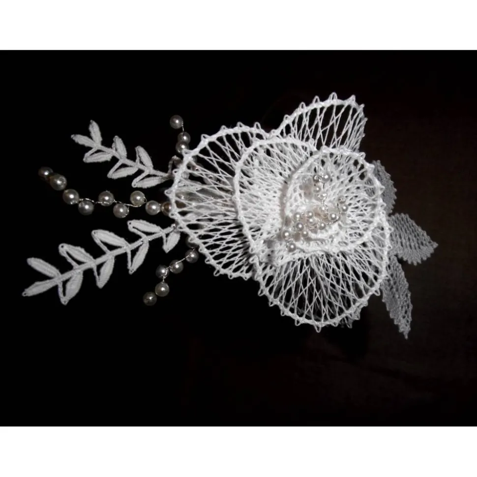 Die Blüten und Blätter für diesen Haarschmuck habe ich nach einem eigenen Entwurf aus weißem Baumwollgarn, silbernem Draht und weißem Viskosegarn von Hand geklöppelt.