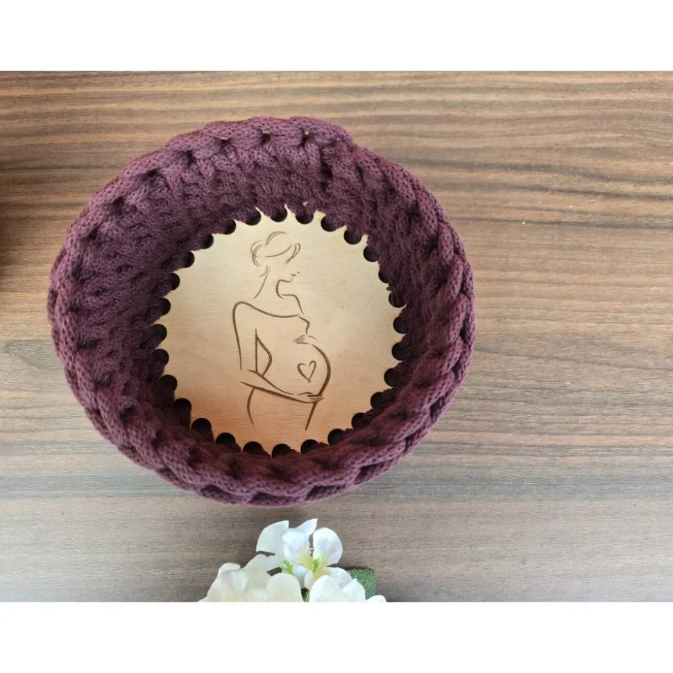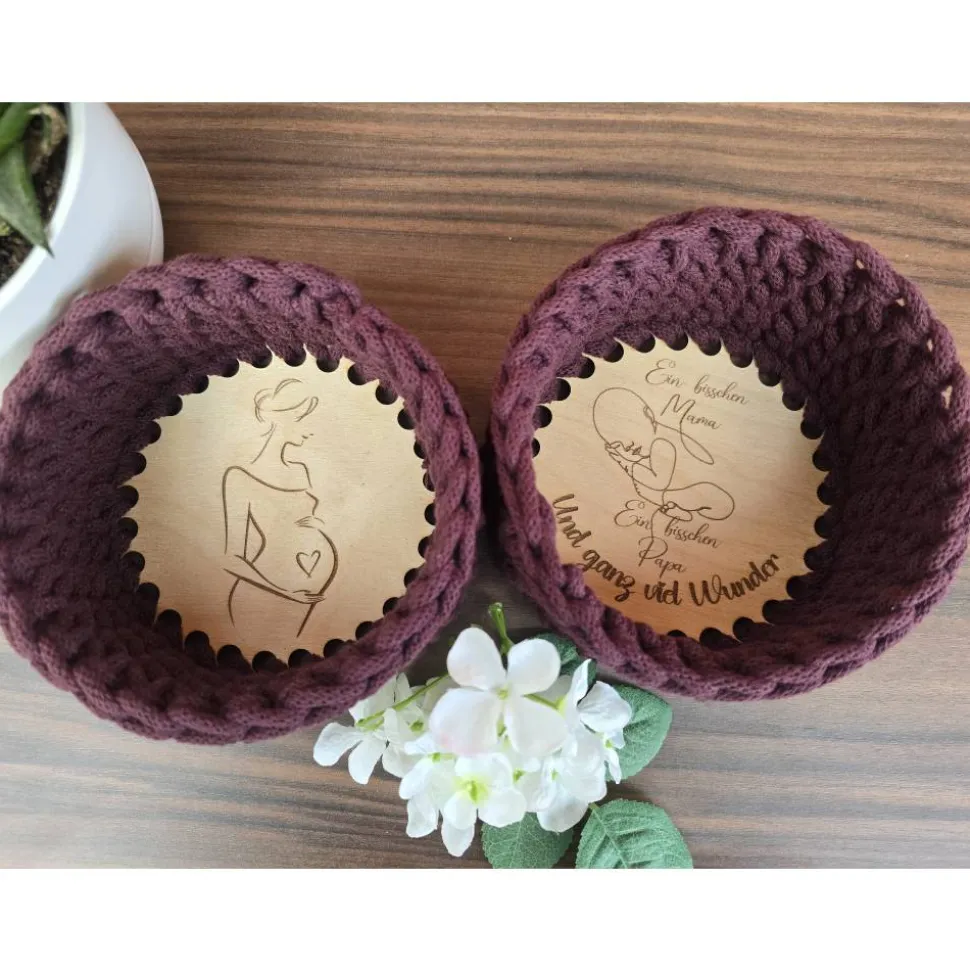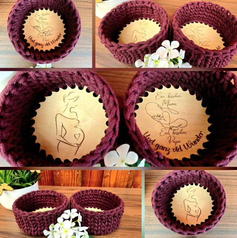 Verschenke diesen Häkelkorb mit graviertem Holzboden an deine Hebamme, Kreißsaalteam, Gynäkologie oder Schwangere.