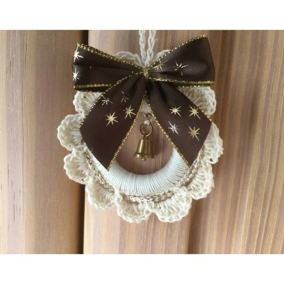 Mit einer gold-weißen Kordel und einer braunen Sternchen-Schleife ist das weihnachtliche Kränzchen dekoriert. Im inneren Ring ist das Kränzchen mit einem goldfarbenen Glöckchen verziert.