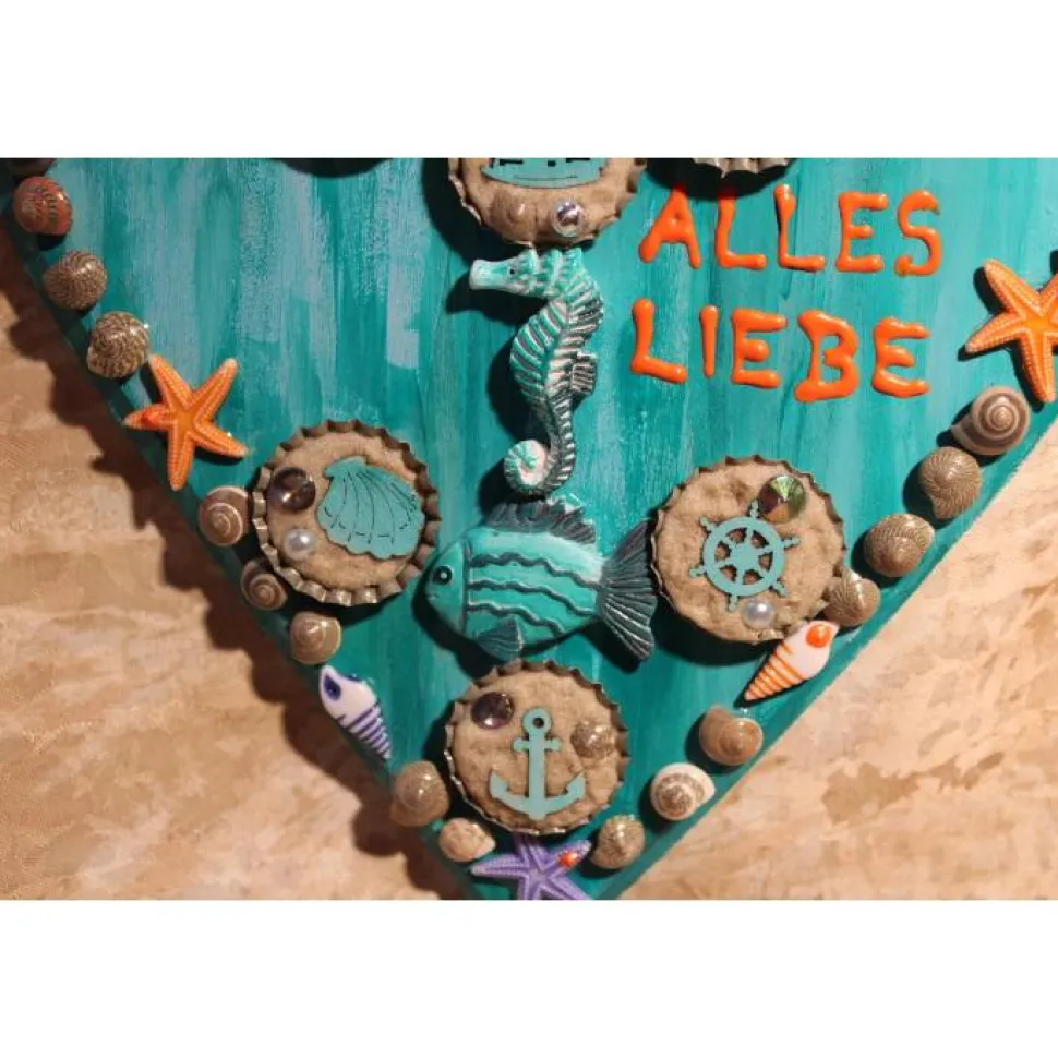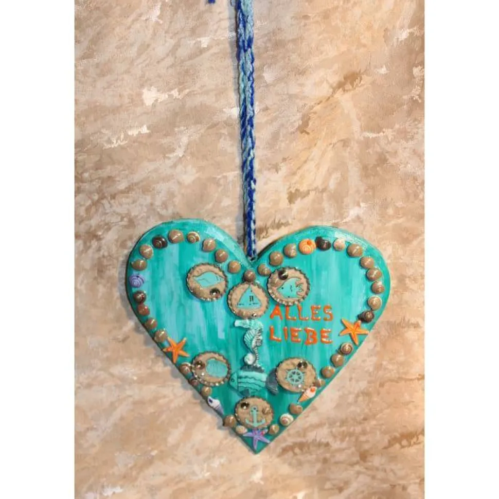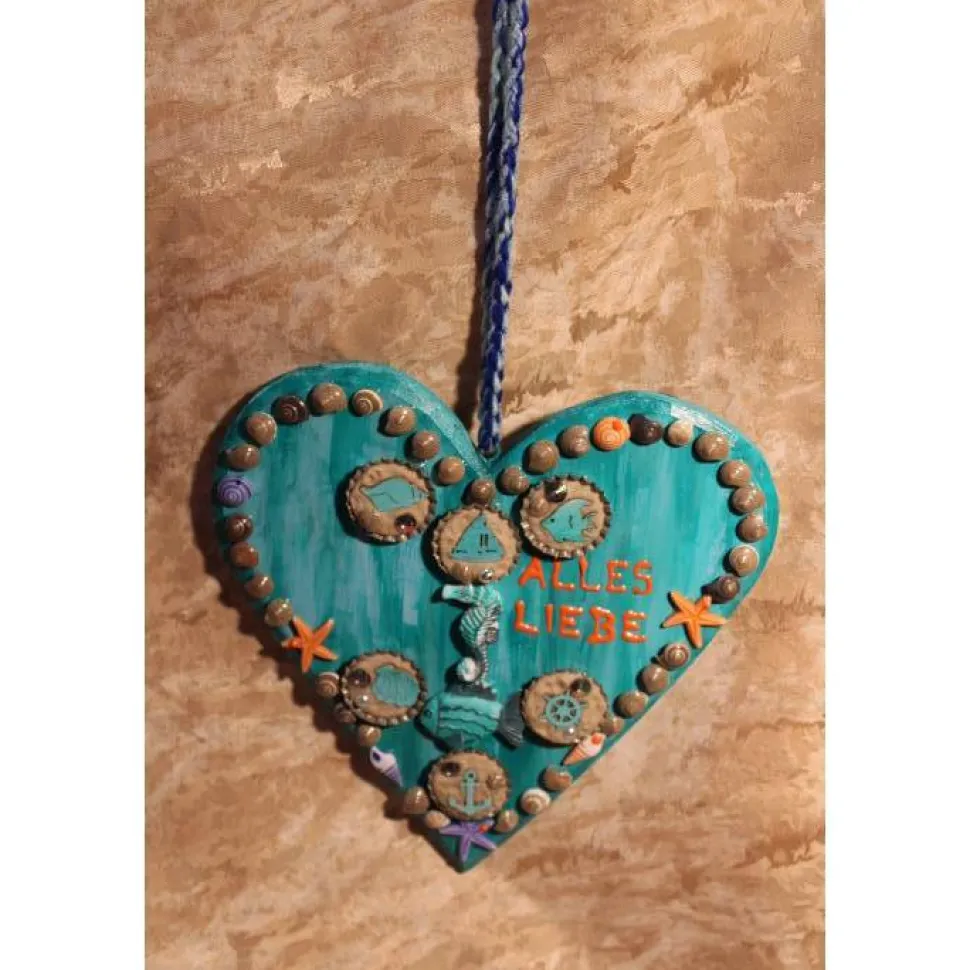 Ein aus Holz zugeschnittenes Herz. Gestaltet mit kleinem Fisch und Seepferdchen aus Polyresin, sowie weiteren maritimen Applikationen aus Holz und Kunststoff. Bemalt mit Acrylfarben in Türkis, Grün und Orange. Verziert mit unzähligen Muscheln, Sand und Kronkorken. Ein bischen Shabby ein bischen Upcycling ;). An dem Herz ist ein gehäkeltes Bändchen in passenden Farben als Aufhängung angebracht. Die Rückseite ist in der passenden Farbe bemalt, siehe Detailfotos.