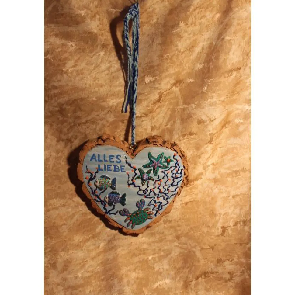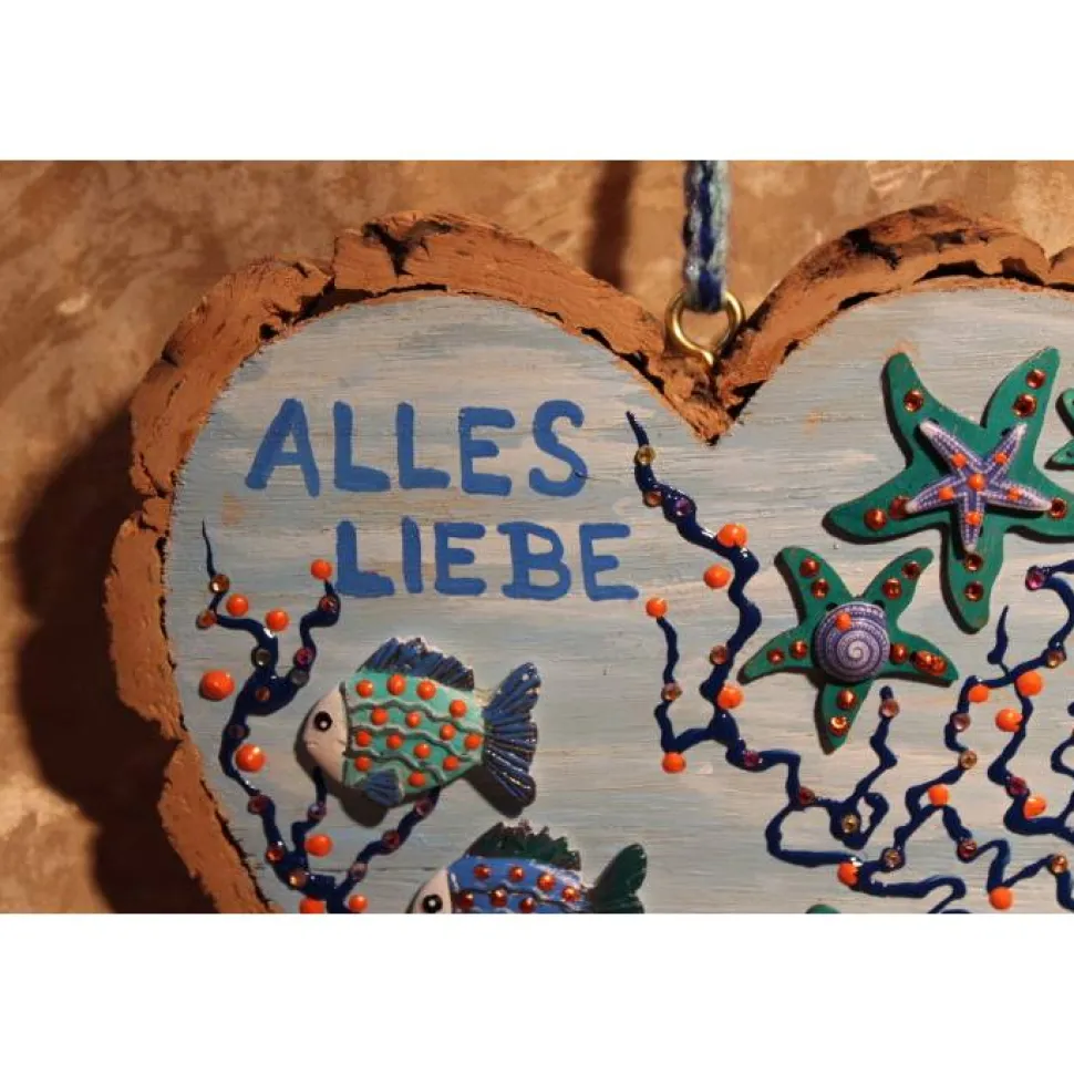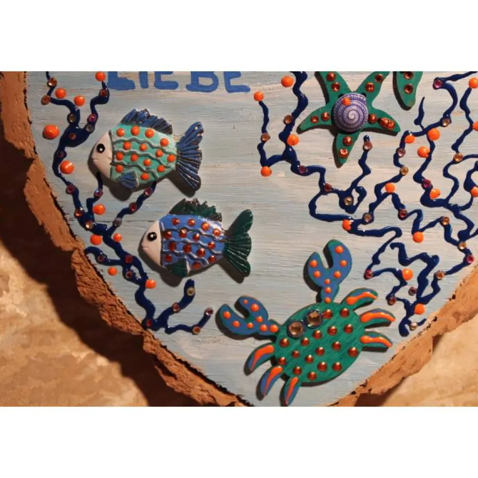 Ein aus Holz zugeschnittenes Herz, mit Rinde an den Seiten verziert. Gestaltet mit kleinen Fischen aus Polyresin, sowie weiteren maritimen Applikationen aus Holz und Kunststoff. Bemalt mit Acrylfarben in Blau, Grün und Orange. Verziert mit kleinen, schillernden Glitzersteinen. An dem Herz ist ein gehäkeltes Bändchen in passenden Farben als Aufhängung angebracht. Die Rückseite ist naturbelassen, siehe Detailfotos.