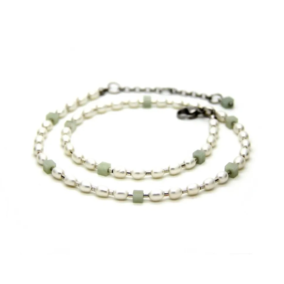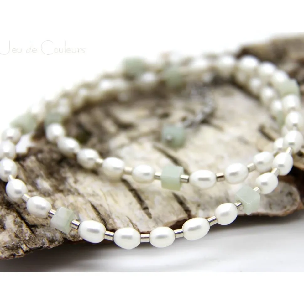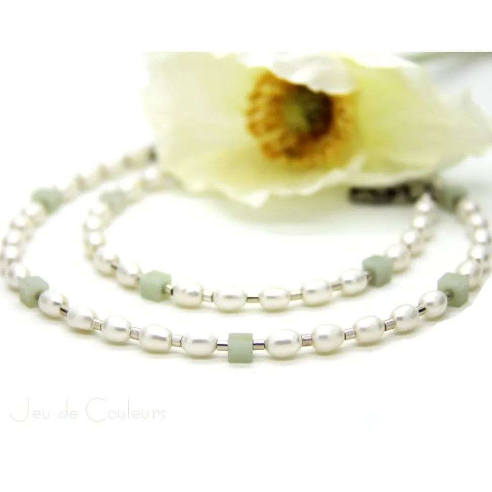 Schneeweiße Zuchtperlen in Reiskorn-Form, Amazonit-Würfel in Zartgrün sowie kleine Echtsilber-Zylinder sind auf nylonummantelten Schmuckdraht arrangiert. Verschlossen wird das himmlische Ensemble mit einem Edelstahl-Karabinerverschluss und einem Verlängerungskettchen, das am Ende mit einem Amazonit-Würfelchen verziert ist (+ 5,5 cm). Sie suchen nach einem eleganten Schmuck-Accessoire, das sie zu festlichen Anlässen, wie beispielsweise Ihre Hochzeit, zum Business-Outfit oder aber zum legeren Jeanslook begleitet?