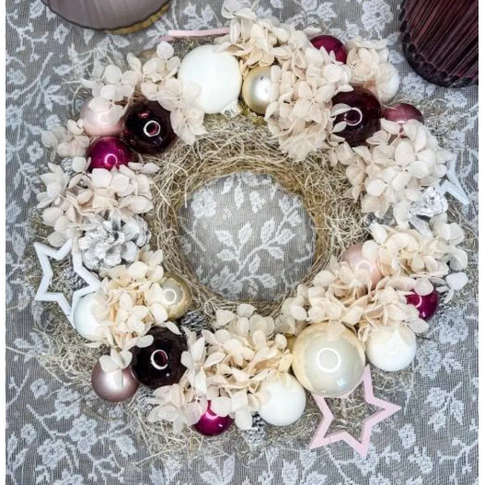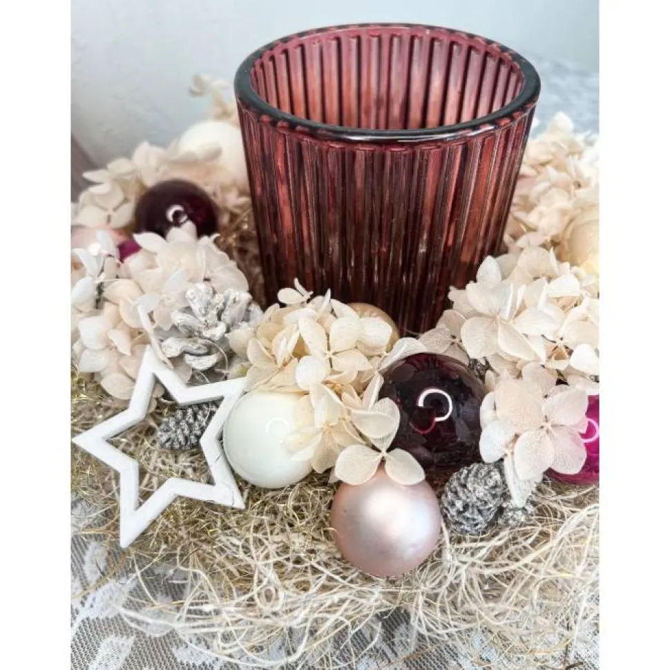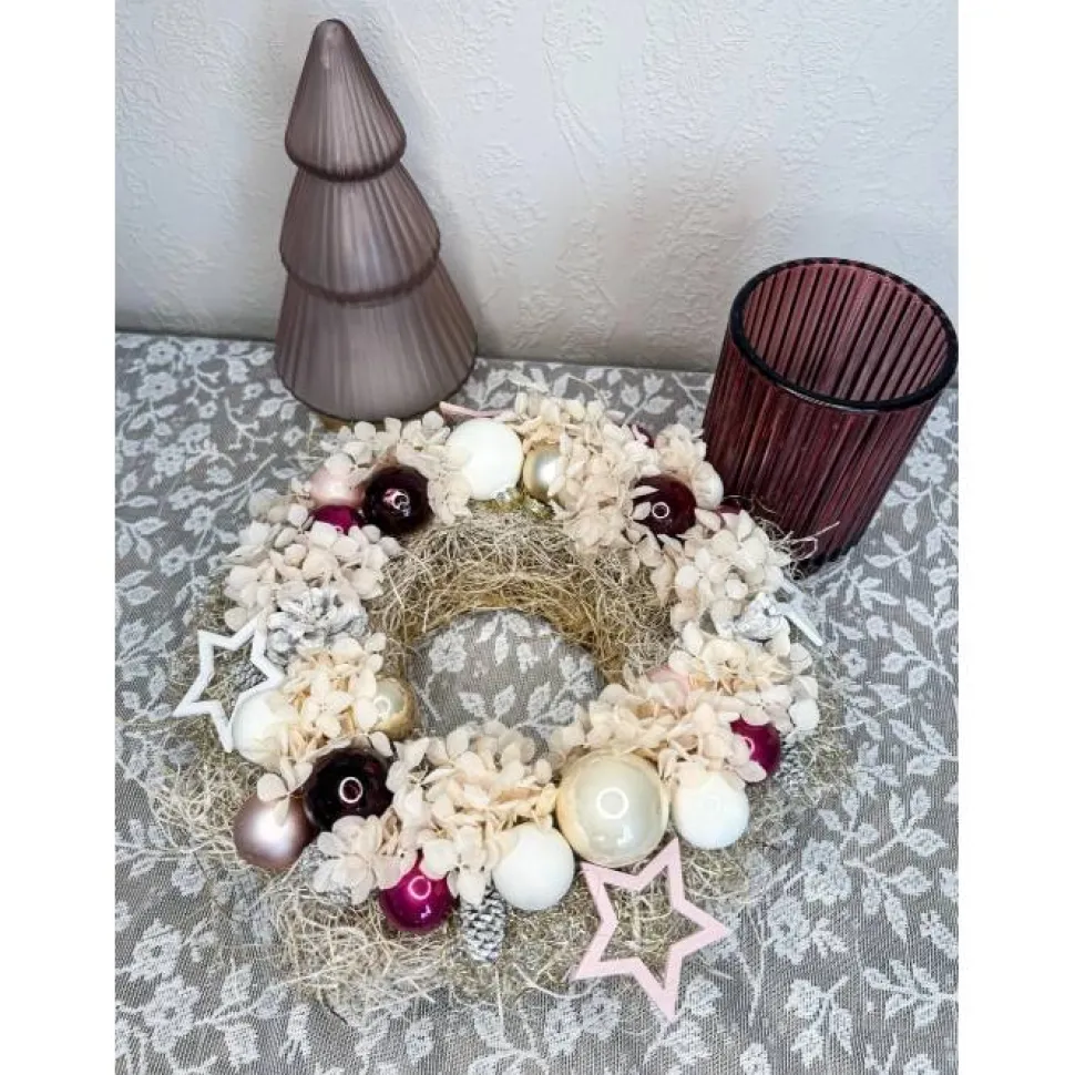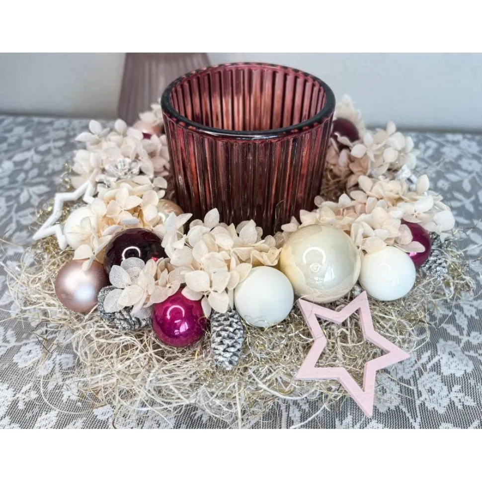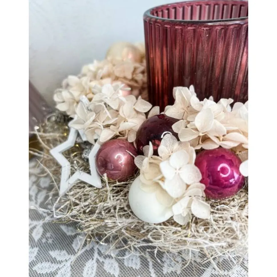 Dieser kleine Adventskranz in Beeren und rosa töne ist die perfekte Ergänzung für deine festliche Dekoration. Der Kranz präsentiert sich in natürlicher Optik mit einem eleganten Glas Windlicht in der Mitte, liebevoll verziert mit konservierten Hortensien in rosa und weißen Zapfen. Die funkelnde Glaskugeln setzen glänzende Akzente. Abgerundet wird das Design mit charmanten Holzsternen. Der Kranz wird mit Liebe zum Detail handgefertigt – ideal als Geschenk oder zum Selbstbehalten für alle, die Beerentöne und Rosa lieben.