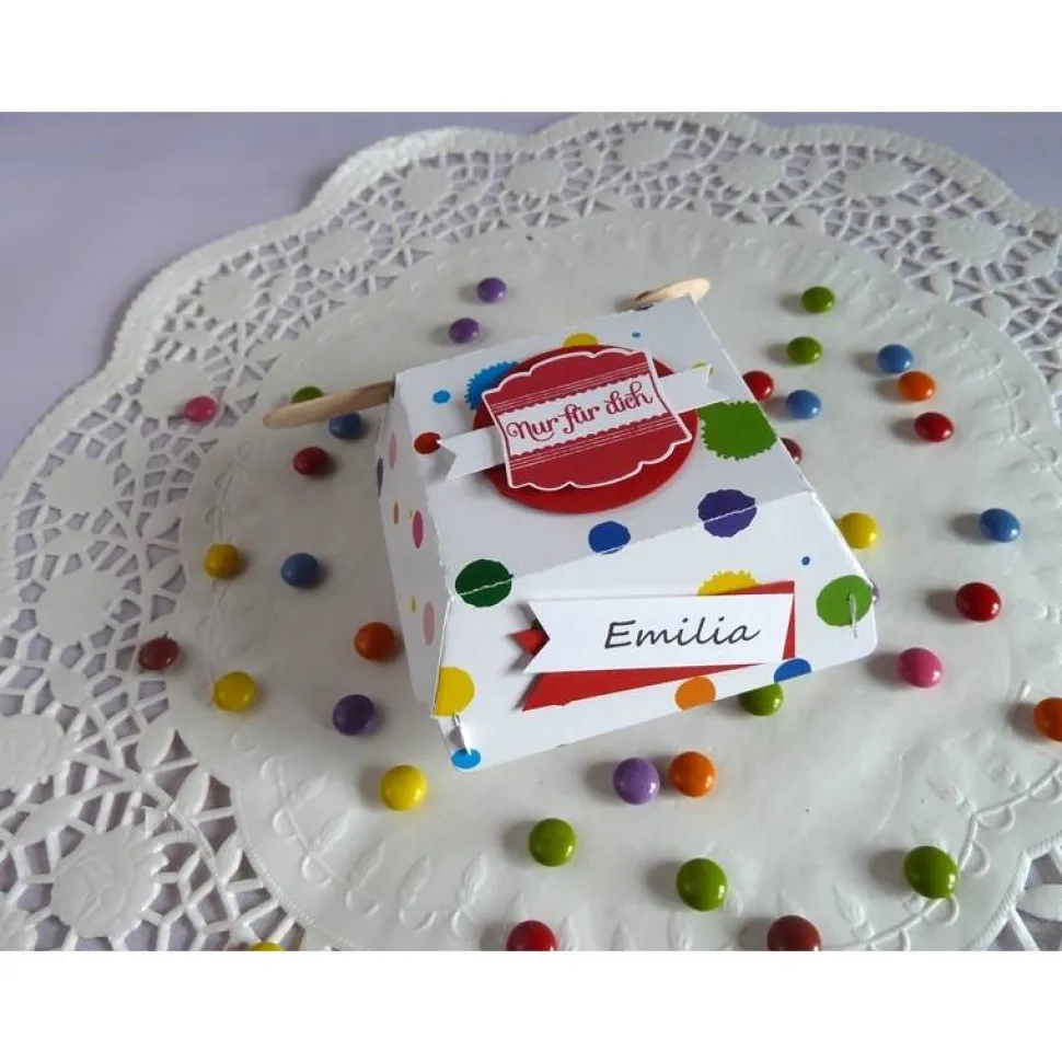 Aus schönem Designpapier, befüllt mit 5 unterschiedlichen Kaubonbons und einem Miniglas Schokocreme (25g) und zusätzlichem Holzlöffelchen welches ich außen hinten an der Hamburgerbox angebracht habe.