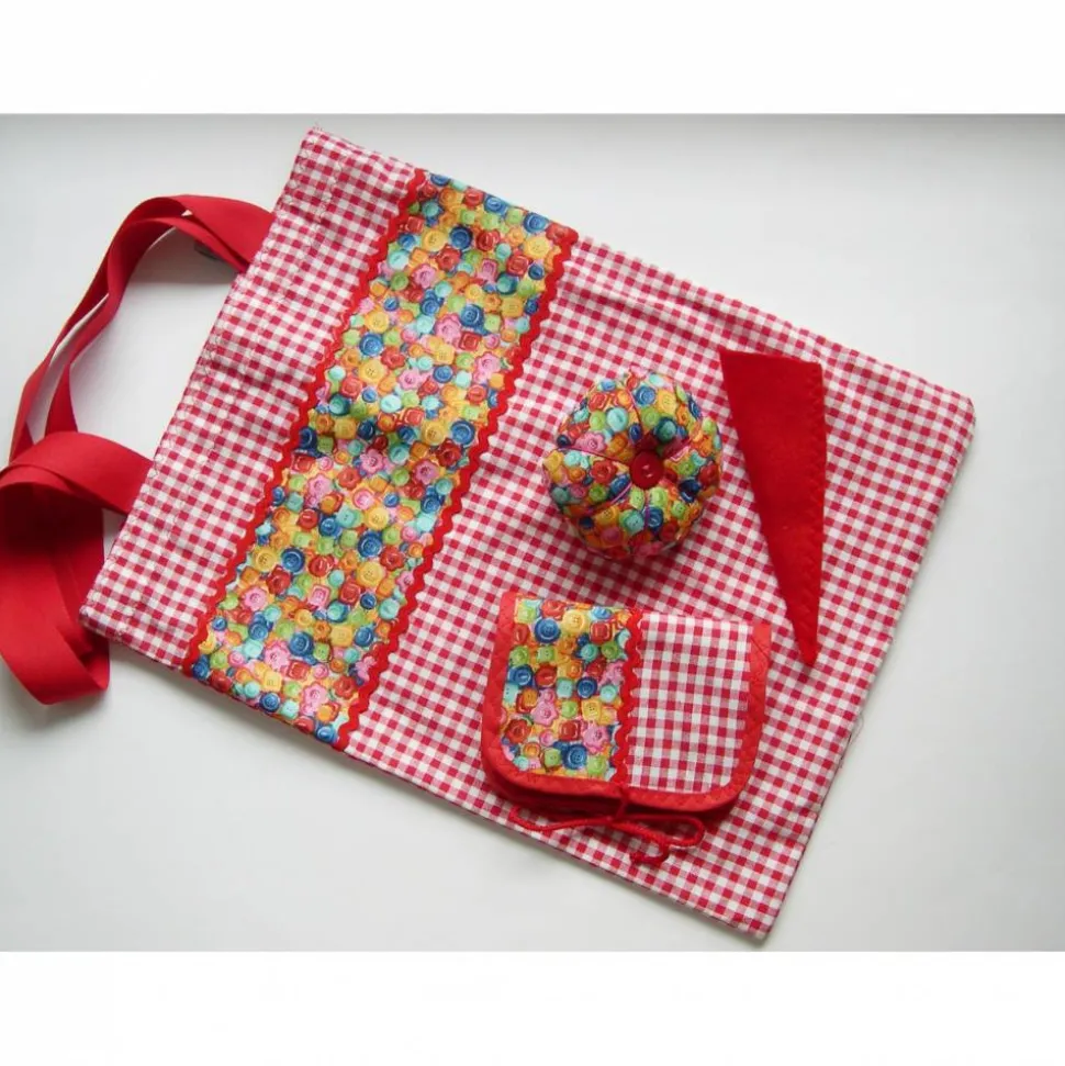 Oberstoffe 100% Baumwolle, Nadelbuch-Blätter 100% Polyester,Nadelkissen-Füllung 100 % Polyester, Scherenetui 100% Polyester