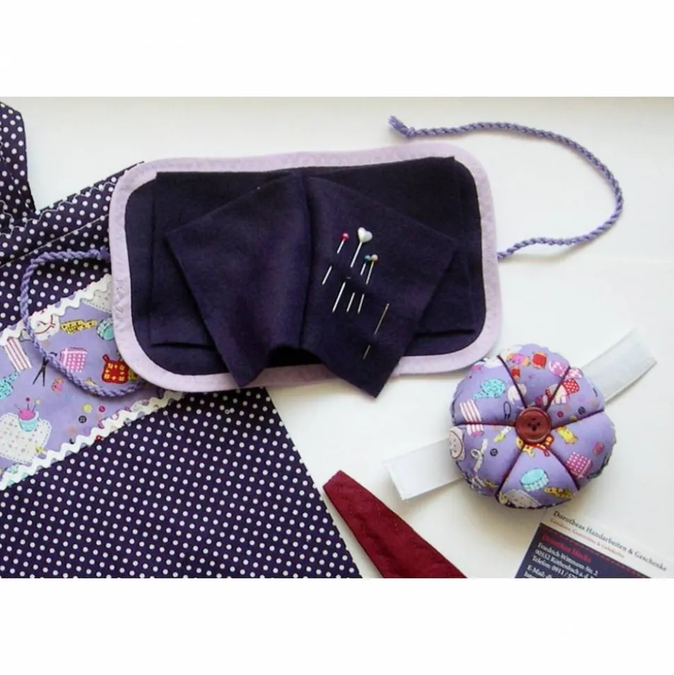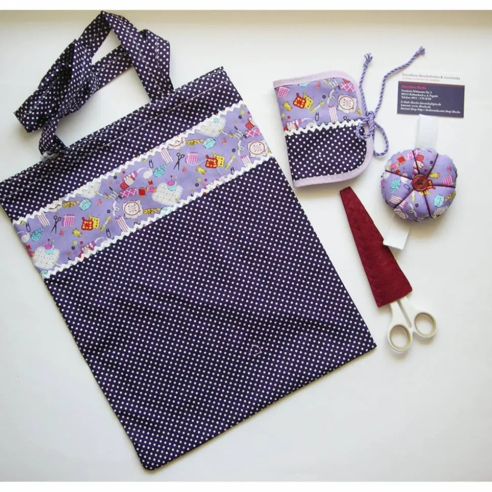 Besetzt wurde der Nähbeutel mit einer Borte aus Nähmotiven, genauso wie das Nadelbuch (ca 8 x 8 cm und das Nadelkissen (Durchmesser ca 8 cm). In die Handarbeitstasche passt problemlos ein Schnellhefter oder eine Klarsichtfolien DIN A 4 hinein, so dass auch Arbeitsanleitungen gut darin Platz finden und geschützt sind.