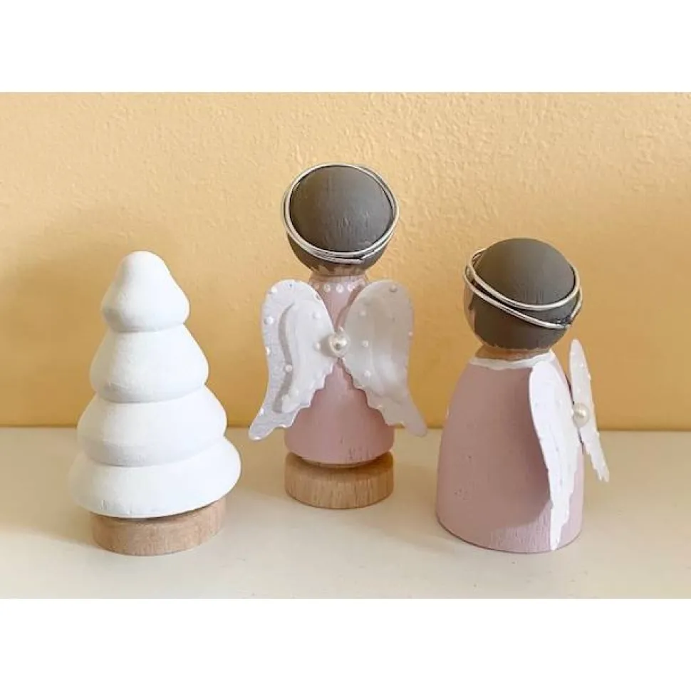 Zwei Engel und ein Weihnachtsbaum aus Holz – perfekt für die festliche Dekoration. Die Engel sind handbemalte Figurenkegel (Peg Dolls) und werden liebevoll mit Kreidefarbe in den Farben weiß und rosa gestaltet. Der Weihnachtsbaum ist ebenfalls in weiß gehalten.