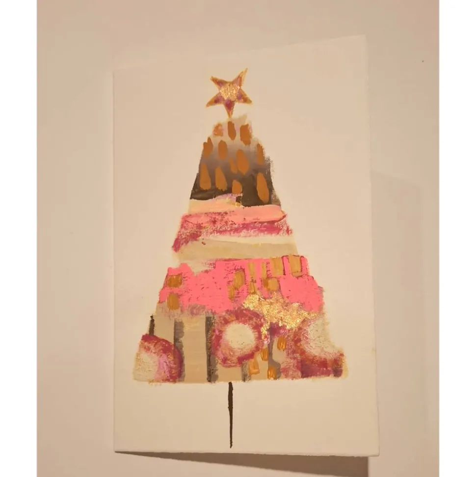 Diese besondere Doppelkarte wurde von Hand gestaltet und ist ein echtes Einzelstück. Der moderne Weihnachtsbaum in vibrierenden Farbtönen wird durch feine Gold-Akzente veredelt und wirkt zugleich frisch und festliche.Ideal als besonderer Gruß, kleine Kunstkarte zum Verschenken oder zum Einrahmen.