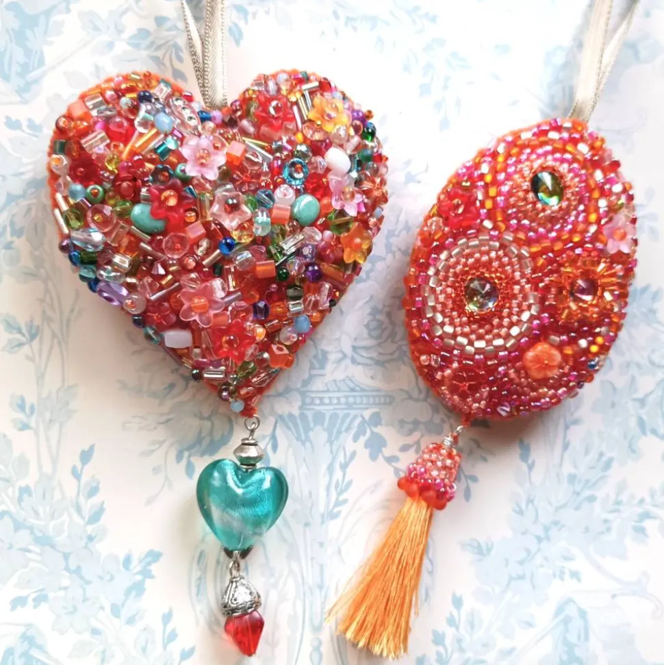 Erlebe ein einzigartiges Luxus-Ornament Osterei als exklusives Highlight für deine Wohndeko! Dieses komplett handgemachte und hochwertig handbestickte Ei ist ein echtes Unikat und mit viel Liebe zum Detail gefertigt. Die opulente Mischung aus Rocailles verschiedener Art aus Glas, antiken Glasperlen und Blütenperlen in Rot, Orange und Hellrosa verleiht diesem Schmuckstück einen edlen, funkelnden Look.