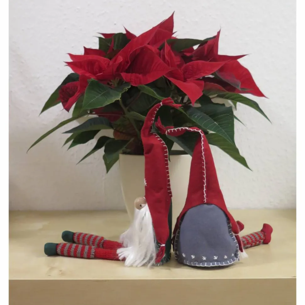 Material: Filz aus 100% Polyester, Schuhe aus Holz, Bart aus 100% Rohseide, Strickschlauch aus 100 % Polyester, Füllwatte aus 100% Polyester, Füllgranulat aus 100% Polypropylen, Stickgarn aus 100% Baumwolle